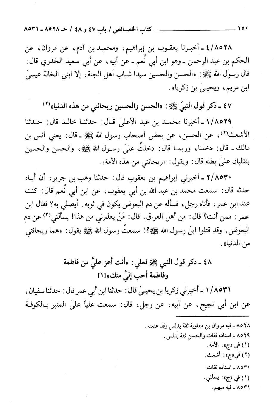 8528 - أخبرنا يعقوب بن إبراهيم ومحمد بن آدم عن مروان عن الحكم بن عبد الرحمن وهو بن أبي نعم عن أبيه عن أبي سعيد الخدري قال قال رسول الله صلى الله عليه و سلم : الحسن والحسين سيدا شباب أهل الجنة إلا ابني الخالة عيسى بن مريم ويحيى بن زكريا