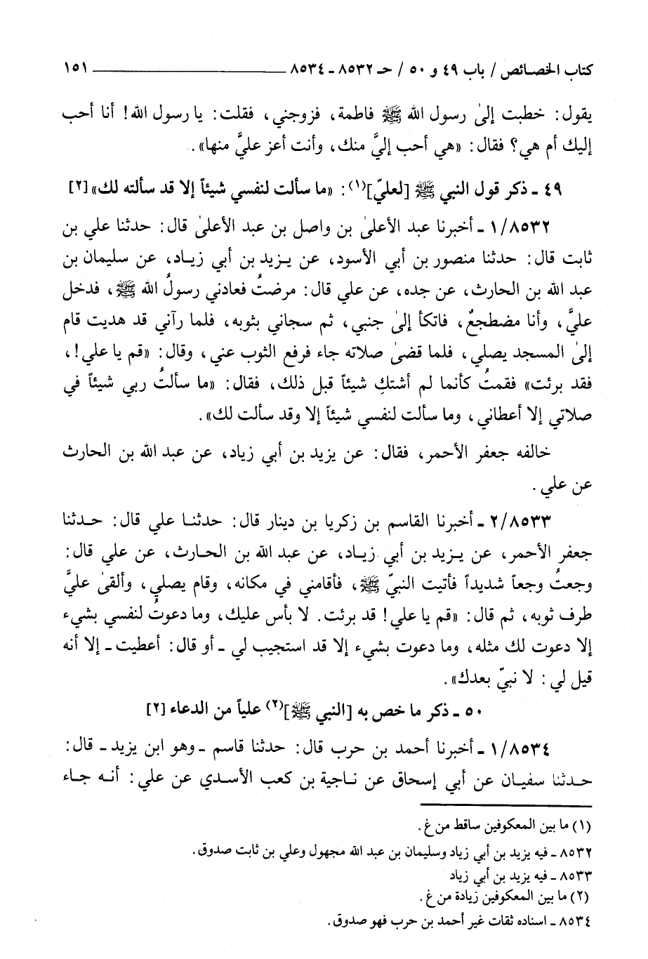 8533 - أخبرنا القاسم بن زكريا بن دينار قال حدثنا علي قال حدثنا جعفر الأحمر عن يزيد بن أبي زياد عن عبد الله بن الحارث عن علي قال : وجعت وجعا شديدا فأتيت النبي صلى الله عليه و سلم فأقامني في مكانه وقام يصلي وألقى علي طرف ثوبه ثم قال قم يا علي قد برئت لا بأس عليك وما دعوت لنفسي بشيء إلا دعوت لك مثله وما دعوت بشيء إلا قد استجيب لي أو قال أعطيت إلا أنه قيل لي لا نبي بعدك