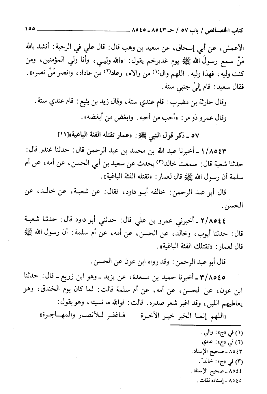 8543 - أخبرنا عبد الله بن محمد بن عبد الرحمن قال حدثنا غندر قال حدثنا شعبة قال سمعت خالد يحدث عن سعيد بن أبي الحسن عن أمه عن أم سلمة : أن رسول الله صلى الله عليه و سلم قال لعمار تقتله الفئة الباغية قال أبو عبد الرحمن خالفه أبو داود فقال عن شعبة عن خالد عن الحسن