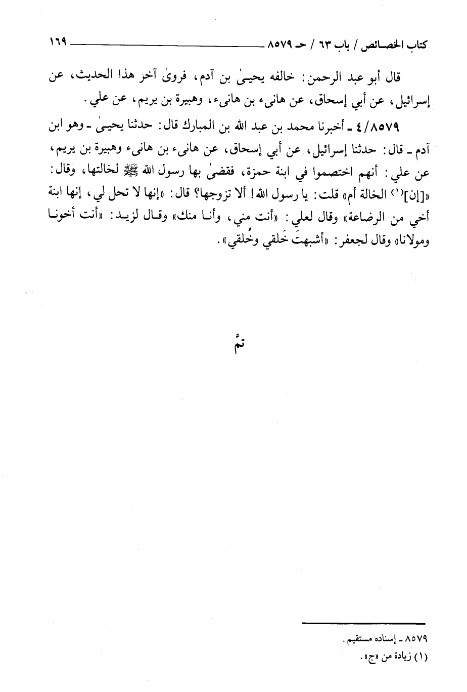 8579 - أخبرنا محمد بن عبد الله بن المبارك قال حدثنا يحيى وهو بن آدم قال حدثنا إسرائيل عن أبي إسحاق عن هانئ بن هانئ وهبيرة بن يريم عن علي : أنهم اختصموا في ابنة حمزة فقضى بها رسول الله صلى الله عليه و سلم لخالتها وقال إن الخالة أم قلت يا رسول الله ألا تزوجها قال إنها لا تحل لي إنها ابنة أخي من الرضاعة وقال لعلي أنت مني وأنا منك وقال لزيد أنت أخونا ومولانا وقال لجعفر