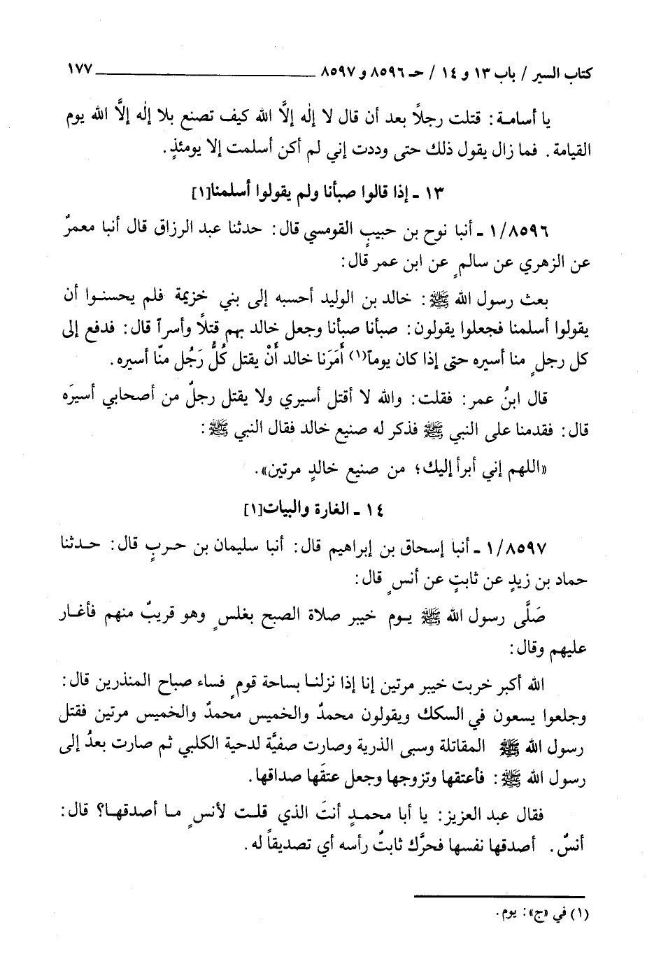 8596 - أنبأ نوح بن حبيب القومسي قال حدثنا عبد الرزاق قال أنبأ معمر عن الزهري عن سالم عن بن عمر قال : بعث رسول الله صلى الله عليه و سلم خالد بن الوليد أحسبه إلى بني خزيمة فلم يحسنوا أن يقولوا أسلمنا فجعلوا يقولون صبأنا صبأنا وجعل خالد بهم قتلا وأسرا قال فدفع إلى كل رجل منا أسيره حتى إذا كان يوما أمرنا خالد أن يقتل كل رجل منا أسيره قال بن عمر فقلت والله لا أقتل أسيري ولا يقتل رجل من أصحابي أسيره قال فقدمنا على النبي صلى الله عليه و سلم فذكر له صنيع خالد فقال النبي صلى الله عليه و سلم اللهم إني أبرأ إليك من صنيع خالد مرتين