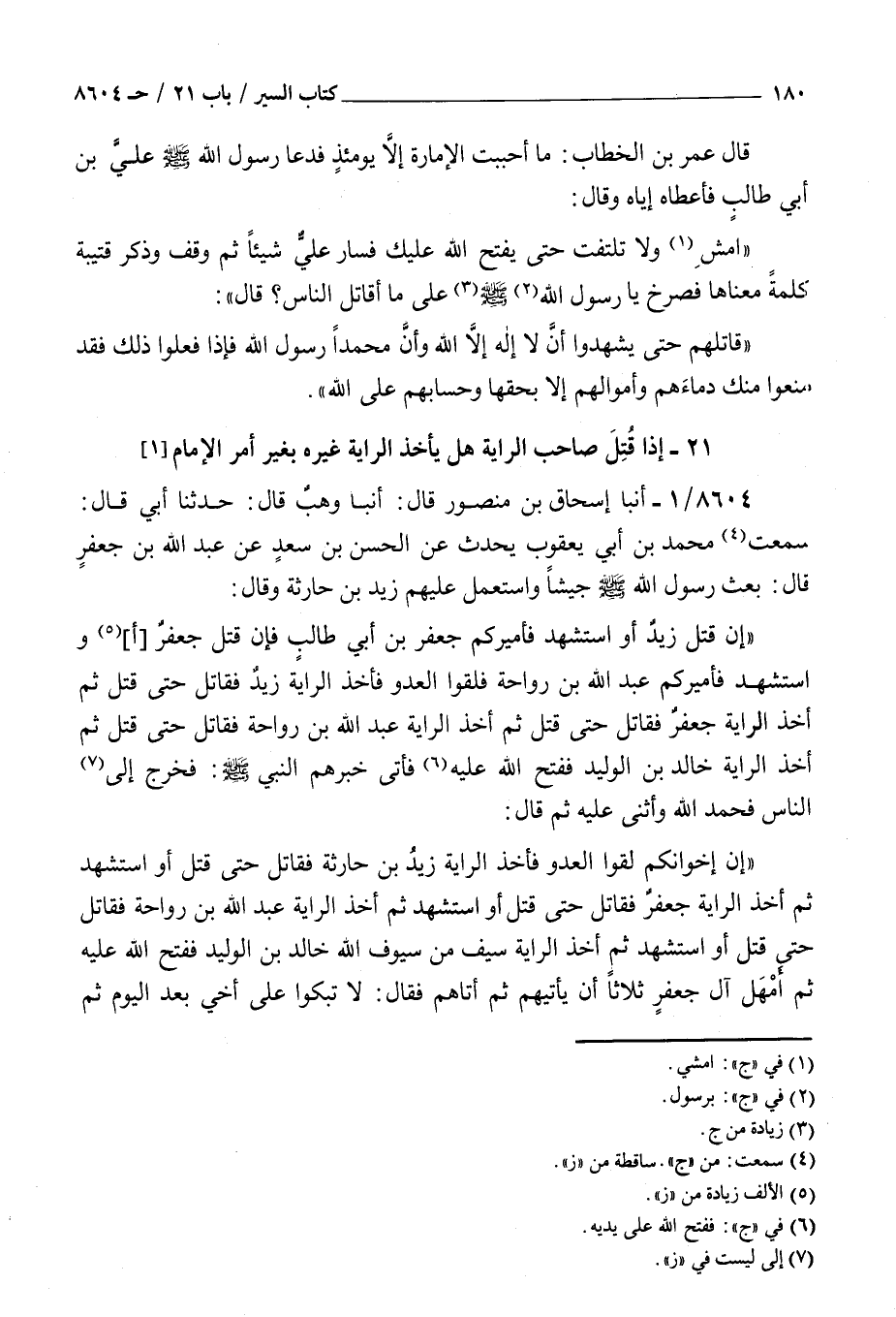 8604 - أنبأ إسحاق بن منصور قال أنبأ وهب قال حدثنا أبي قال سمعت محمد بن أبي يعقوب يحدث عن الحسن بن سعد عن عبد الله بن جعفر قال : بعث رسول الله صلى الله عليه و سلم جيشا واستعمل عليهم زيد بن حارثة وقال إن قتل زيد أو استشهد فأميركم جعفر بن أبي طالب فإن قتل جعفر أو استشهد فأميركم عبد الله بن رواحة فلقوا العدو فأخذ الراية زيد فقاتل حتى قتل ثم أخذ الراية جعفر فقاتل حتى قتل ثم أخذ الراية عبد الله بن رواحة فقاتل حتى قتل ثم أخذ الراية خالد بن الوليد ففتح الله عليه فأتى خبرهم النبي صلى الله عليه و سلم فخرج إلى الناس فحمد الله وأثنى عليه ثم قال إن إخوانكم لقوا العدو فأخذ الراية زيد بن حارثة فقاتل حتى قتل أو استشهد ثم أخذ الراية جعفر فقاتل حتى قتل أو استشهد ثم أخذ الراية عبد الله بن رواحة فقاتل حتى قتل أو استشهد ثم أخذ الراية سيف من سيوف الله خالد بن الوليد ففتح الله عليه ثم أمهل آل جعفر ثلاثا أن يأتيهم ثم أتاهم فقال لا تبكوا على أخي بعد اليوم ثم قال ادعوا لي بني أخي فجيء بنا كأننا أفرخ فقال ادعوا لي الحلاق فأمره فحلق رؤوسنا ثم قال أما محمد فشبيه عمنا أبي طالب وأما عبد الله فشبيه خلقي وخلقي ثم أخذ بيدي فأسالها فقال اللهم اخلف جعفرا في أهله وبارك لعبد الله في صفقة يمينه ثلاثا
