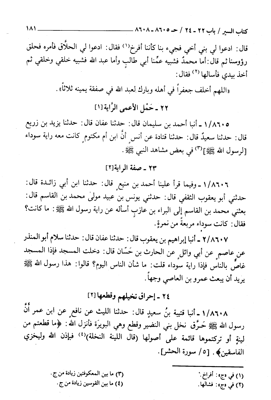 8605 - أنبأ أحمد بن سليمان قال حدثنا عفان قال حدثنا يزيد بن زريع قال حدثنا سعيد قال حدثنا قتادة عن أنس : أن بن أم مكتوم كانت معه راية سوداء لرسول الله صلى الله عليه و سلم في بعض مشاهد النبي صلى الله عليه و سلم