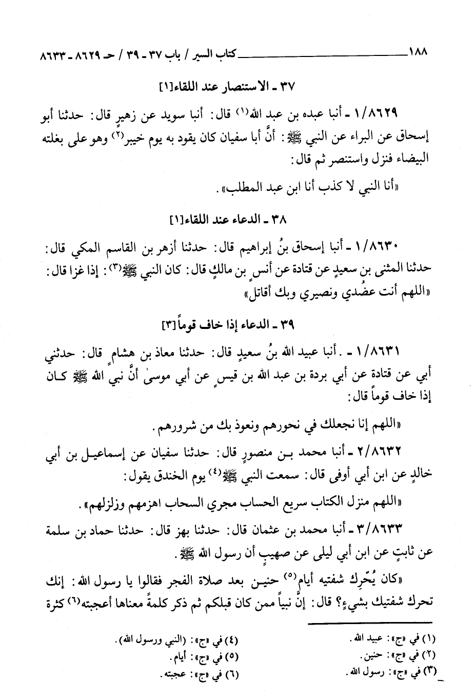 8629 - أنبأ عبده بن عبد الله قال أنبأ سويد عن زهير قال حدثنا أبو إسحاق عن البراء عن النبي صلى الله عليه و سلم : أن أبا سفيان كان يقود به يوم خيبر وهو على بغلته البيضاء فنزل واستنصر ثم قال أنا النبي لا كذب أنا بن عبد المطلب