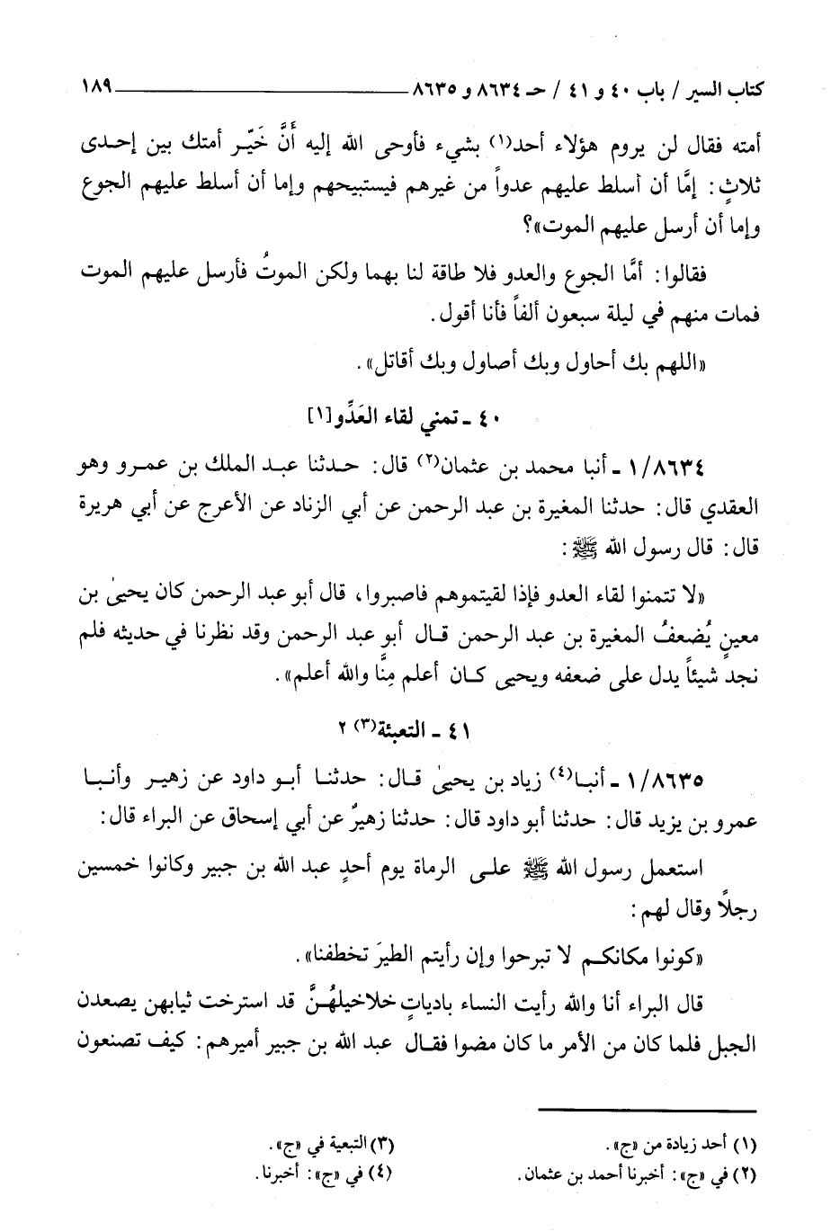 8635 - أنبأ زياد بن يحيى قال حدثنا أبو داود عن زهير وأنبأ عمرو بن يزيد قال حدثنا أبو داود قال حدثنا زهير عن أبي إسحاق عن البراء قال : استعمل رسول الله صلى الله عليه و سلم على الرماة يوم أحد عبد الله بن جبير وكانوا خمسين رجلا وقال لهم كونوا مكانكم لا تبرحوا وإن رأيتم الطير تخطفنا قال البراء أنا والله رأيت النساء باديات خلاخيلهن قد استرخت ثيابهن يصعدن الجبل فلما كان من الأمر ما كان مضوا فقال عبد الله بن جبير أميرهم كيف تصنعون يقول رسول الله صلى الله عليه و سلم فمضوا فكان الذي كان فلما كان الليل جاء أبو سفيان بن حرب فقال أفيكم محمد فقال رسول الله صلى الله عليه و سلم لا تجيبوه ثم قال أفيكم محمد فلم يجيبوه ثم قال أفيكم محمد الثالثة فلم يجيبوه فقال أفيكم بن أبي قحافة فلم يجيبوه فقال أفيكم بن أبي قحافة فلم يجيبوه حتى قالها ثلاثا ثم قال أفيكم بن الخطاب حتى قالها ثلاثا فلم يجيبوه فقال أما هؤلاء فقد كفيتموهم فلم يملك عمر نفسه فقال كذبت يا عدو الله ها هو ذا رسول الله صلى الله عليه و سلم وأبو بكر وأنا أحياء ولك منا يوم سوء فقال يوم بيوم بدر الحرب سجال وقال في حديث زياد ثم قال أعل هبل فقال رسول الله صلى الله عليه و سلم أجيبوه قالوا ما نقول يا رسول الله صلى الله عليه و سلم قال قولوا الله أعز وفي حديث زياد الله أعلى وأجل ثم قال لنا عزى ولا عزى لكم فقال رسول الله صلى الله عليه و سلم أجيبوه قالوا يا رسول الله وما نقول قال قولوا الله مولانا ولا مولى لكم ثم قال أبو سفيان إنكم سترون في القوم مثلة لم آمر بها ثم قال لم تسؤني