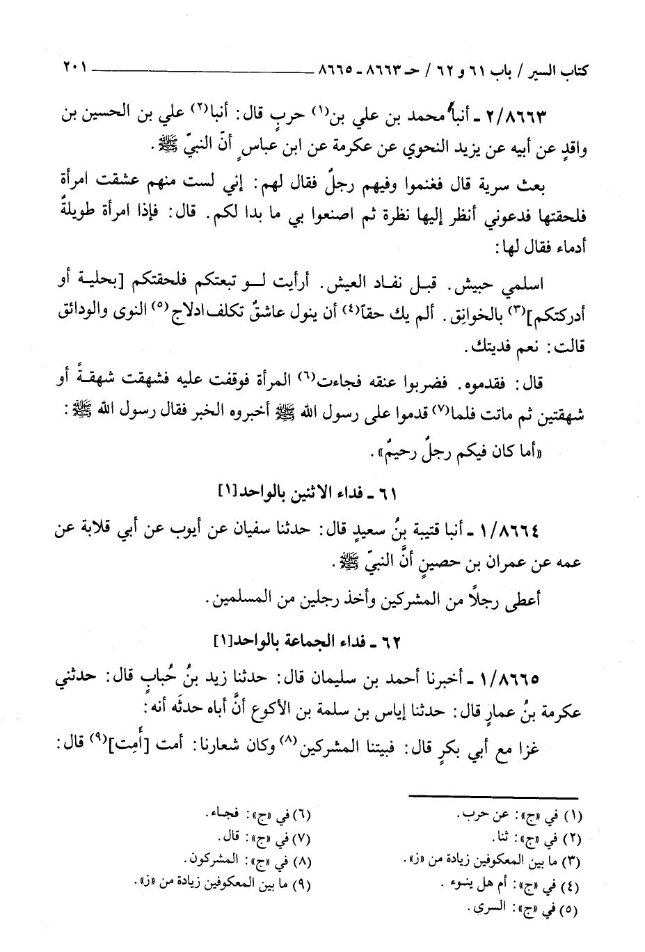 8664 - أنبأ قتيبة بن سعيد قال حدثنا سفيان عن أيوب عن أبي قلابة عن عمه عن عمران بن حصين : أن النبي صلى الله عليه و سلم أعطى رجلا من المشركين وأخذ رجلين من المسلمين