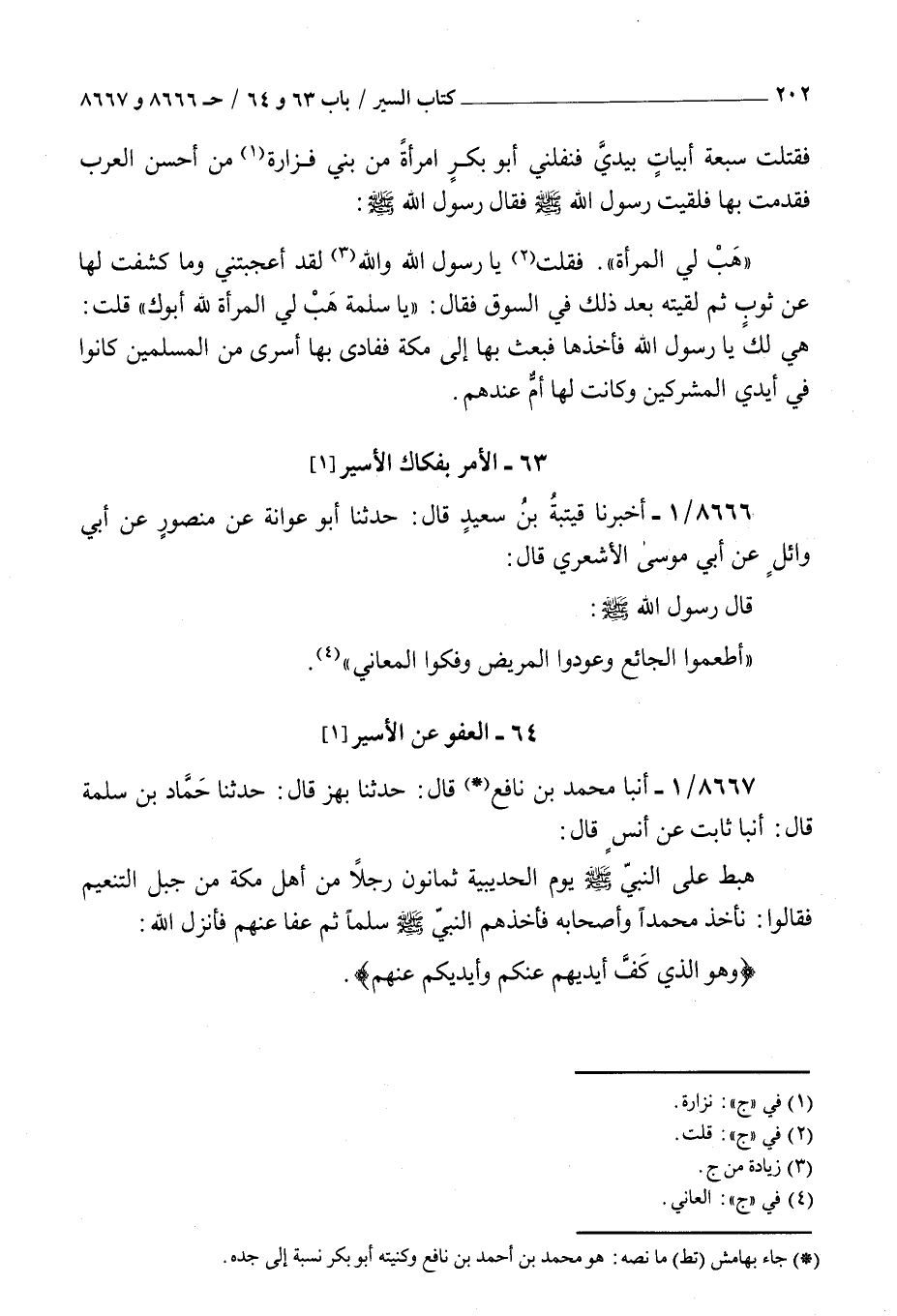 8666 - أخبرنا قتيبة بن سعيد قال حدثنا أبو عوانة عن منصور عن أبي وائل عن أبي موسى الأشعري قال قال رسول الله صلى الله عليه و سلم : أطعموا الجائع وعودوا المريض وفكوا المعاني