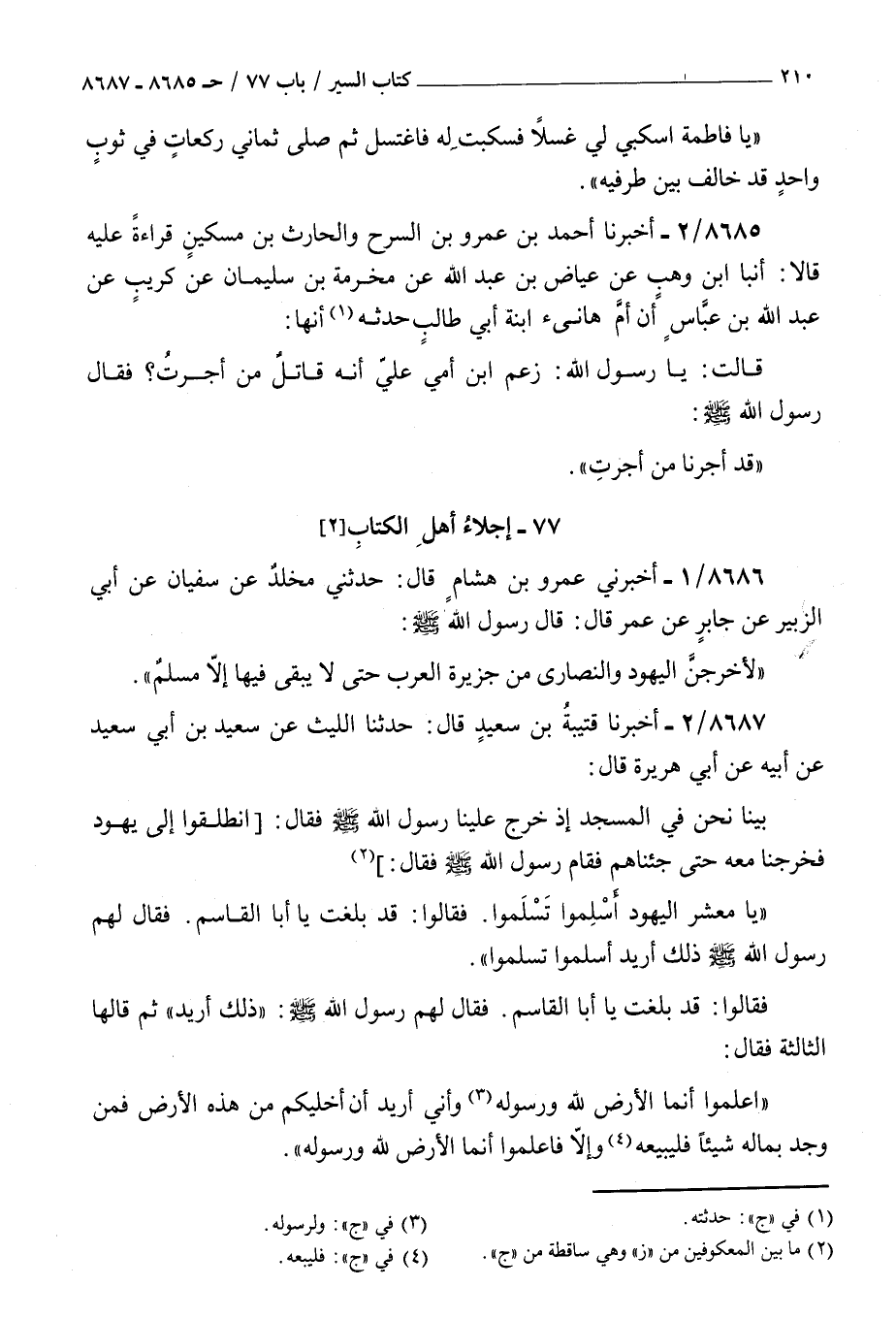 8686 - أخبرني عمرو بن هشام قال حدثني مخلد عن سفيان عن أبي الزبير عن جابر عن عمر قال قال رسول الله صلى الله عليه و سلم : لأخرجن اليهود والنصارى من جزيرة العرب حتى لا يبقى فيها إلا مسلم