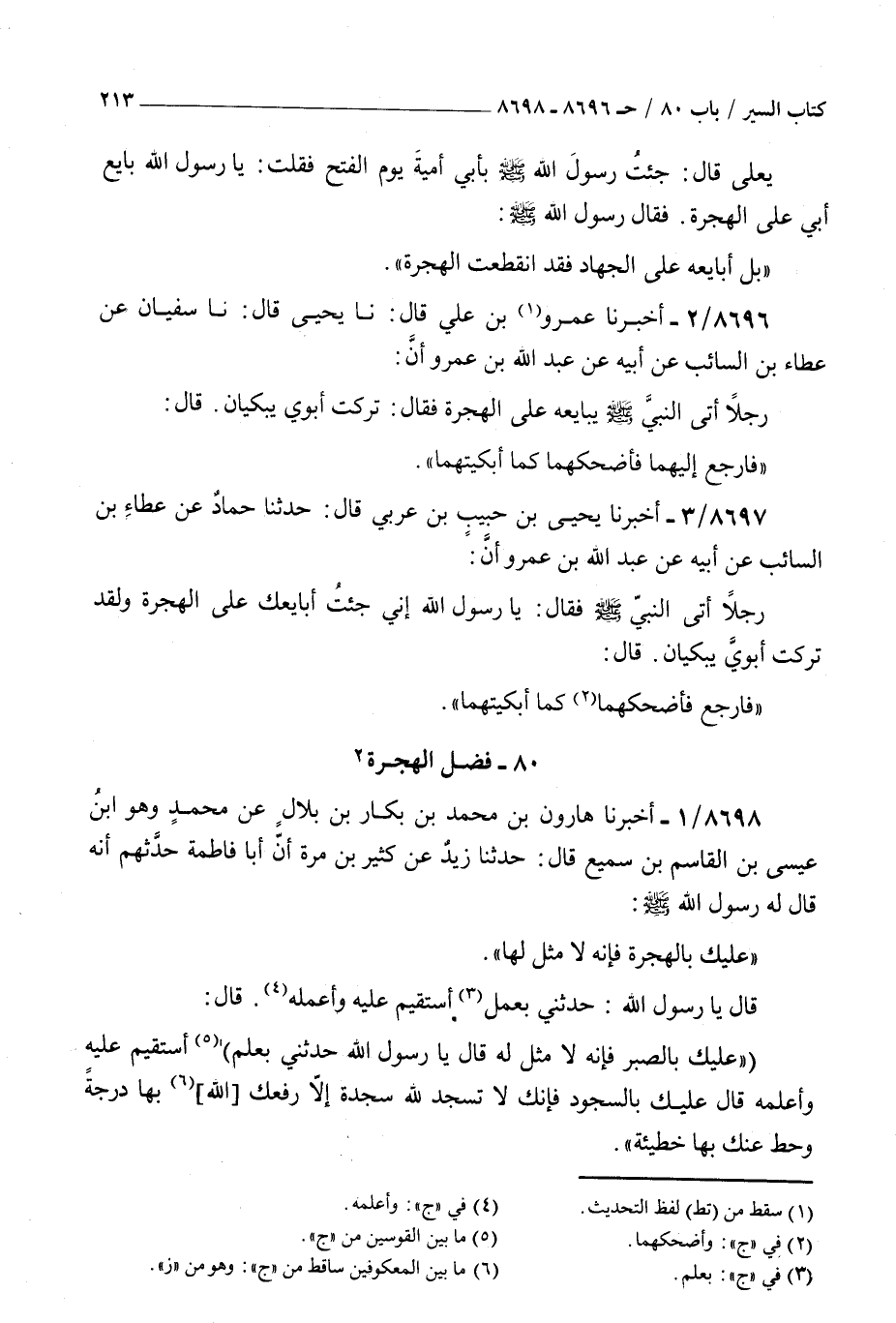 8696 - أخبرنا عمرو بن علي قال نا يحيى قال نا سفيان عن عطاء بن السائب عن أبيه عن عبد الله بن عمرو : أن رجلا أتى النبي صلى الله عليه و سلم يبايعه على الهجرة فقال تركت أبوي يبكيان قال فارجع إليهما فأضحكهما كما أبكيتهما