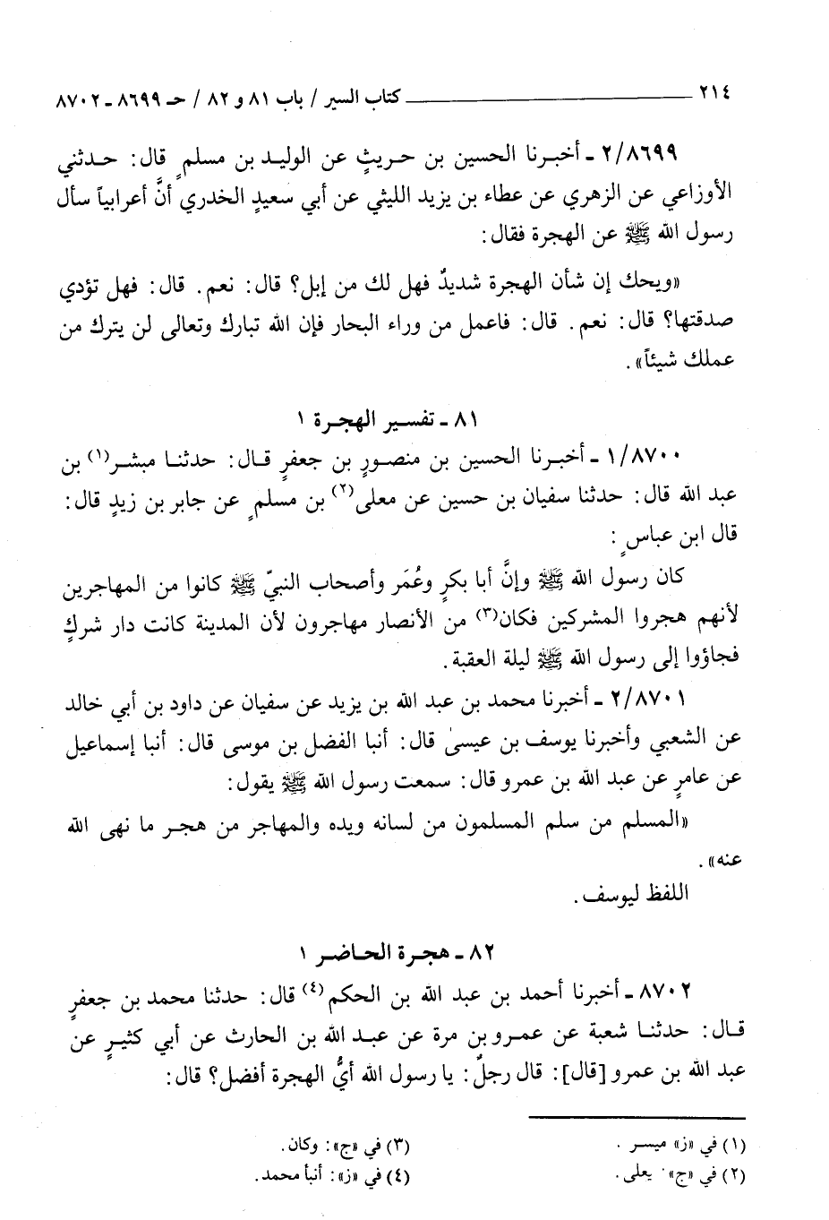 8700 - أخبرنا الحسين بن منصور بن جعفر قال حدثنا مبشر بن عبد الله قال حدثنا سفيان بن حسين عن معلى بن مسلم عن جابر بن زيد قال قال بن عباس : كان رسول الله صلى الله عليه و سلم وإن أبا بكر وعمر وأصحاب النبي صلى الله عليه و سلم كانوا من المهاجرين لأنهم هجروا المشركين فكان من الأنصار مهاجرون لأن المدينة كانت دار شرك فجاؤوا إلى رسول الله صلى الله عليه و سلم ليلة العقبة