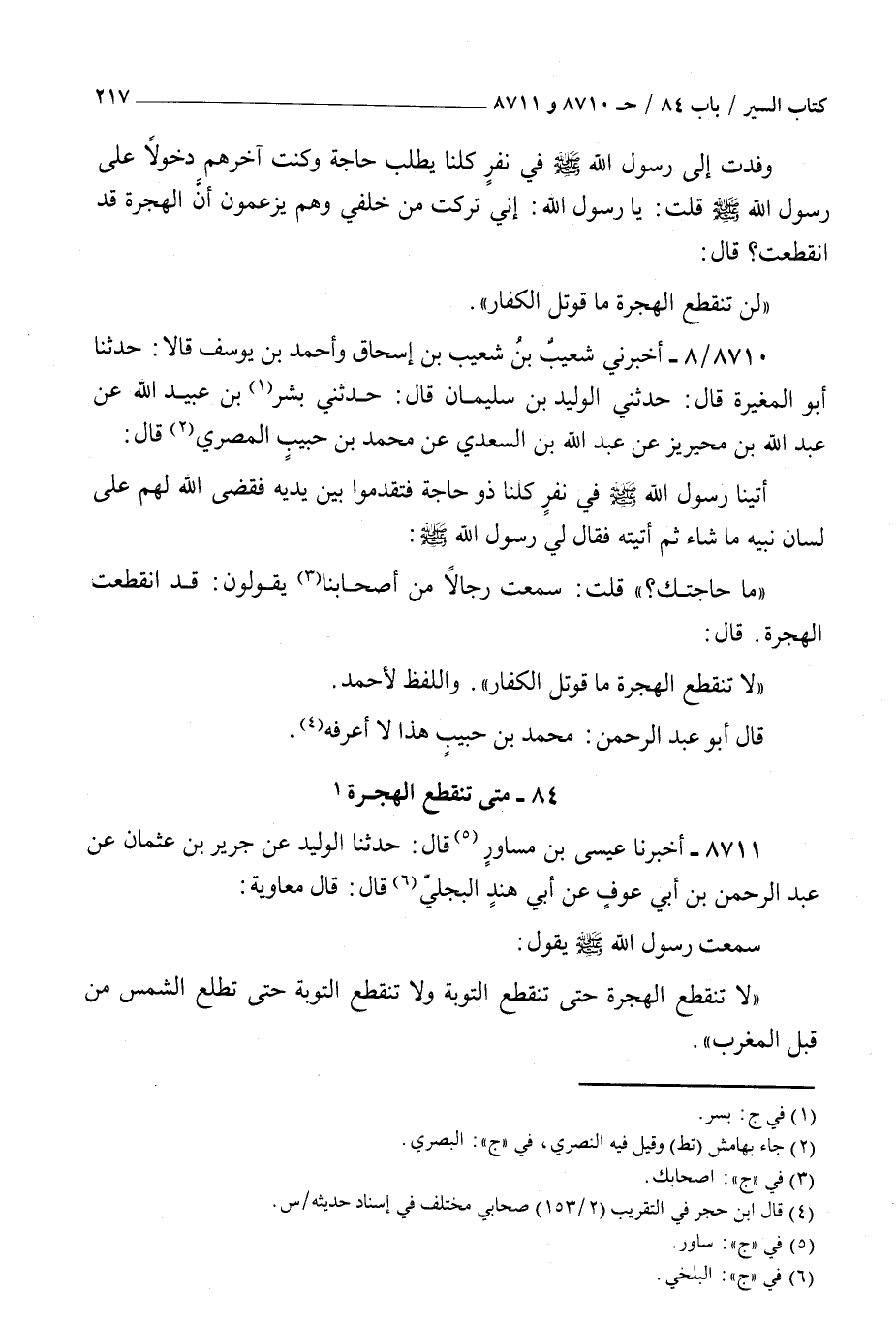 8710 - أخبرني شعيب بن شعيب بن إسحاق وأحمد بن يوسف قالا حدثنا أبو المغيرة قال حدثني الوليد بن سليمان قال حدثني بشر بن عبيد الله عن عبد الله بن محيريز عن عبد الله بن السعدي عن محمد بن حبيب المصري قال : أتينا رسول الله صلى الله عليه و سلم في نفر كلنا ذو حاجة فتقدموا بين يديه فقضى الله لهم على لسان نبيه ما شاء ثم أتيته فقال لي رسول الله صلى الله عليه و سلم ما حاجتك قلت سمعت رجالا من أصحابنا يقولون قد انقطعت الهجرة قال لا تنقطع الهجرة ما قوتل الكفار واللفظ لأحمد قال أبو عبد الرحمن محمد بن حبيب هذا لا أعرفه