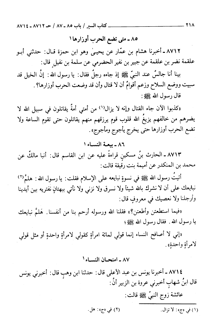 8712 - أخبرنا هشام بن عمار عن يحيى وهو بن حمزة قال حدثني أبو علقمة نضر بن علقمة عن جبير بن نفير الحضرمي عن سلمة بن نفيل قال : بينا أنا جالس عند النبي صلى الله عليه و سلم إذ جاءه رجل فقال يا رسول الله إن الخيل قد سبيت ووضع السلاح وزعم أقوام أن لا قتال وأن قد وضعت الحرب أوزارها قال رسول الله صلى الله عليه و سلم كذبوا الآن جاء القتال وإنه لا يزال من أمتي أمة يقاتلون في سبيل الله لا يضرهم من خالفهم يزيغ الله قلوب قوم يرزقهم منهم يقاتلون حتى تقوم الساعة ولا تضع الحرب أوزارها حتى يخرج يأجوج ومأجوج