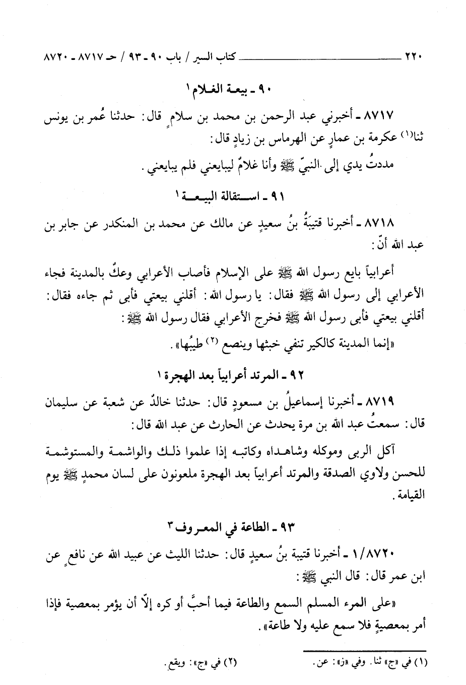 8718 - أخبرنا قتيبة بن سعيد عن مالك عن محمد بن المنكدر عن جابر بن عبد الله : أن أعرابيا بايع رسول الله صلى الله عليه و سلم على الإسلام فأصاب الأعرابي وعك بالمدينة فجاء الأعرابي إلى رسول الله صلى الله عليه و سلم فقال يا رسول الله أقلني بيعتي فأبى ثم جاءه فقال أقلني بيعتي فأبى رسول الله صلى الله عليه و سلم فخرج الأعرابي فقال رسول الله صلى الله عليه و سلم إنما المدينة كالكير تنفي خبثها وينصع طيبها