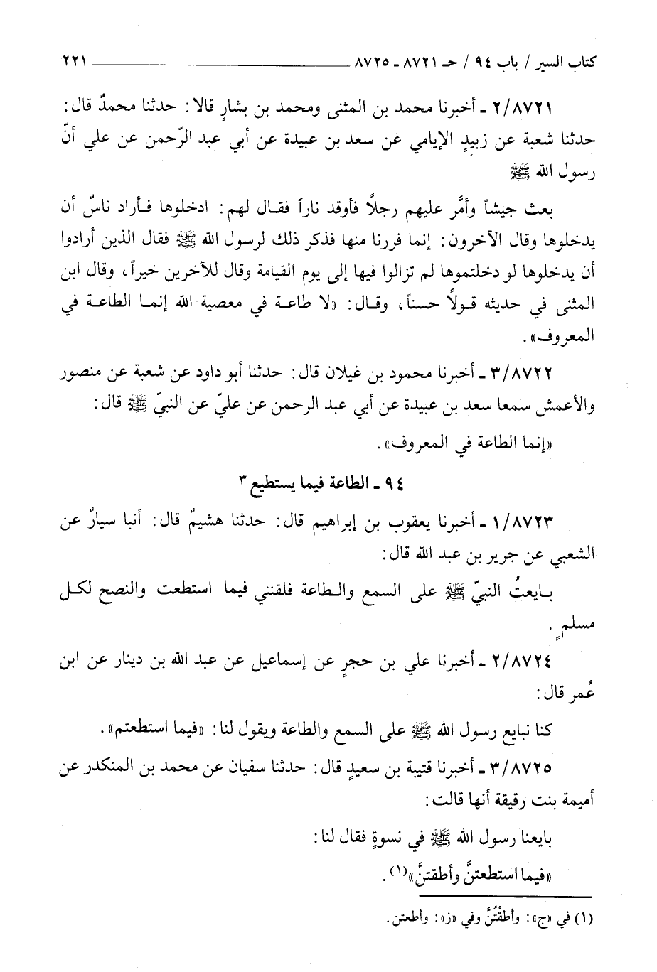 8722 - أخبرنا محمود بن غيلان قال حدثنا أبو داود عن شعبة عن منصور والأعمش سمعا سعد بن عبيدة عن أبي عبد الرحمن عن علي عن النبي صلى الله عليه و سلم قال : إنما الطاعة في المعروف
