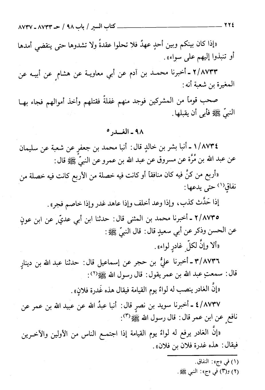 8736 - أخبرنا علي بن حجر عن إسماعيل قال حدثنا عبد الله بن دينار قال سمعت عبد الله بن عمر يقول قال رسول الله صلى الله عليه و سلم : إن الغادر ينصب له لواء يوم القيامة فيقال هذه غدرة فلان