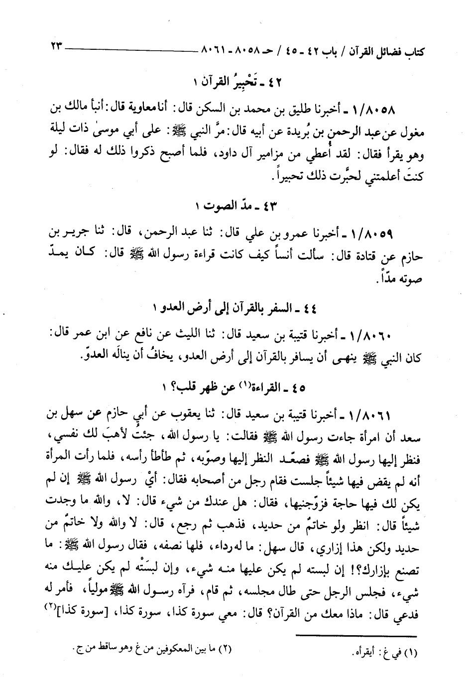 8060 - أخبرنا قتيبة بن سعيد قال ثنا الليث عن نافع عن بن عمر قال : كان النبي صلى الله عليه و سلم ينهى أن يسافر بالقرآن إلى أرض العدو يخاف أن يناله العدو