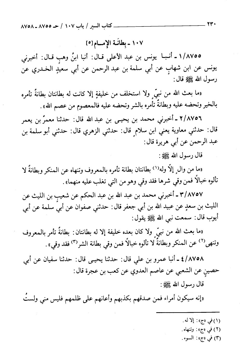 8755 - أنبأ يونس بن عبد الأعلى قال أنبأ بن وهب قال أخبرني يونس عن بن شهاب عن أبي سلمة بن عبد الرحمن عن أبي سعيد الخدري عن رسول الله صلى الله عليه و سلم قال : ما بعث الله من نبي ولا استخلف من خليفة إلا كانت له بطانتان بطانة تأمره بالخير وتحضه عليه وبطانة تأمره بالشر وتحضه عليه فالمعصوم من عصم الله
