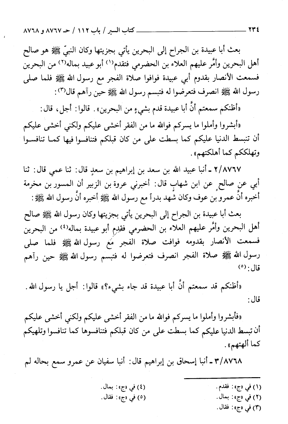8767 - أنبأ عبيد الله بن سعد بن إبراهيم بن سعد قال ثنا عمي قال ثنا أبي عن صالح عن بن شهاب قال أخبرني عروة بن الزبير أن المسور بن مخرمة أخبره أن عمرو بن عوف وكان شهد بدار مع رسول الله صلى الله عليه و سلم أخبره : أن رسول الله صلى الله عليه و سلم بعث أبا عبيدة بن الجراح إلى البحرين يأتى بجزيتها وكان رسول الله صلى الله عليه و سلم صالح أهل البحرين وأمر عليهم العلاء بن الحضرمي فقدم أبو عبيدة بماله من البحرين فسمعت الأنصار بقدومه فوافت صلاة الفجر مع رسول الله صلى الله عليه و سلم فلما صلى رسول الله صلى الله عليه و سلم صلاة الفجر انصرف فتعرضوا له فتبسم رسول الله صلى الله عليه و سلم حين رآهم قال أظنكم قد سمعتم ان أبا عبيدة قد جاء بشيء قالوا أجل يا رسول الله قال فأبشروا وأملوا ما يسركم فوالله ما من الفقر أخشى عليكم ولكني أخشى عليكم ان تبسط الدنيا عليكم كما بسطت على من كان قبلكم فتنافسوها كما تنافسوا وتلهيكم كما ألهتهم