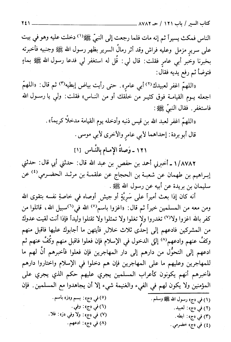 8782 - أخبرني أحمد بن حفص بن عبد الله قال حدثني أبي قال حدثني إبراهيم بن طهمان عن شعبة بن الحجاج عن علقمة بن مرثد الحضرمي عن سليمان بن بريدة عن أبيه عن رسول الله صلى الله عليه و سلم : انه كان إذا بعث أميرا على سرية أو جيش أوصاه في خاصة نفسه بتقوى الله ومن معه من المسلمين خيرا ثم قال اغزوا باسم الله في سبيل الله قاتلوا من كفر بالله اغزوا ولا تغدروا ولا تغلوا ولا تمثلوا ولا تقتلوا وليدا فإذا أنت لقيت عدوك من المشركين فادعهم إلى إحدى ثلاث خلال فأيتهن ما أجابوك عليها فاقبل منهم وكف عنهم وادعهم إلى الدخول في الإسلام فإن فعلوا فاقبل منهم وكف عنهم ثم ادعهم إلى التحول من دارهم إلى دار المهاجرين فإن فعلوا فأخبرهم ان لهم ما للمهاجرين وعليهم ما على المهاجرين فإن هم دخلوا في الإسلام واختاروا دارهم فأخبرهم أنهم يكونون كأعراب المسلمين يجرى عليهم حكم الذي يجرى على المؤمنين ولا يكون لهم في الفيء والغنيمة شيء الا ان يجاهدوا مع المسلمين فإن أبوا فادعهم إلى إعطاء الجزية فإن فعلوا فاقبل منهم وكف عنهم فإن أبوا فاستعن بالله عليهم ثم قاتلهم وإن أنت حاجزت أهل حصن فأرادوا أن تنزلهم على حكم الله فلا تنزلهم على حكم الله ولكن أنزلهم على حكمك فإنك لا تدرى أتصيب فيهم حكم الله وإن أنت حاصرت أهل حصن فأرادوا ان تجعل لهم ذمة الله وذمة رسوله صلى الله عليه و سلم فلا تجعل لهم ذمة الله وذمة رسوله صلى الله عليه و سلم ولكن اجعل لهم ذمتك وذمة آبائك وذمم أصحابك فإنكم إن تخفروا ذمتكم وذمم آبائكم وذمم أصحابكم أهون عليكم من ان تخفروا ذمة الله وذمة رسوله صلى الله عليه و سلم