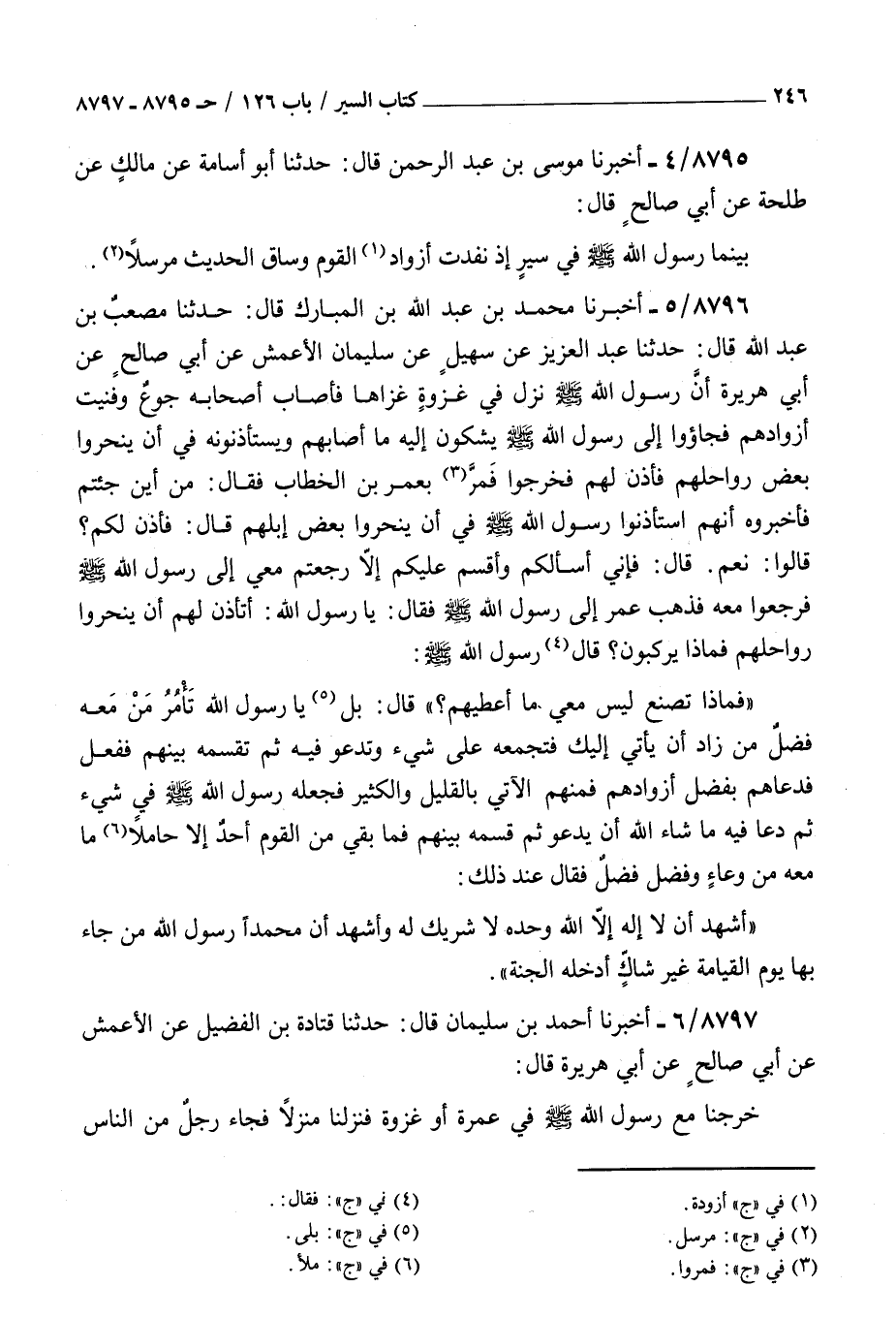 8797 - أخبرنا أحمد بن سليمان قال حدثنا قتادة بن الفضيل عن الأعمش عن أبي صالح عن أبي هريرة قال : خرجنا مع رسول الله صلى الله عليه و سلم في عمرة أو غزوة فنزلنا منزلا فجاء رجل من الناس فقال يا رسول الله لو ذبحنا بعض ظهرنا فرآنا المشركون حسنة حالنا فقال ما شئتم فجاء عمر فقال النبي صلى الله عليه و سلم اجمع زادهم فادع الله فجاء القوم بأزوادهم من دقيق وتمر وشعير فدعا عليه وقال علي بأوعيتكم فجاؤوا بها فاحتملوا ما شاء الله وفضل منهم فضل كثير فقال رسول الله صلى الله عليه و سلم أنا عبد الله وأنا رسول الله من جاء بها لم يحجب من الجنة