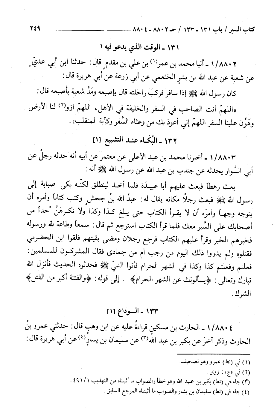 8802 - أنبأ محمد بن عمر بن علي بن مقدم قال حدثنا بن أبي عدى عن شعبة عن عبد الله بن بشر الخثعمي عن أبي زرعة عن أبي هريرة قال : كان رسول الله صلى الله عليه و سلم إذا سافر فركب راحلته قال بإصبعه ومد شعبة بأصبعه قال اللهم أنت الصاحب في السفر والخليفة في الأهل اللهم ازو لنا الأرض وهون علينا السفر اللهم إني أعوذ بك من وعثاء السفر وكآبة المنقلب