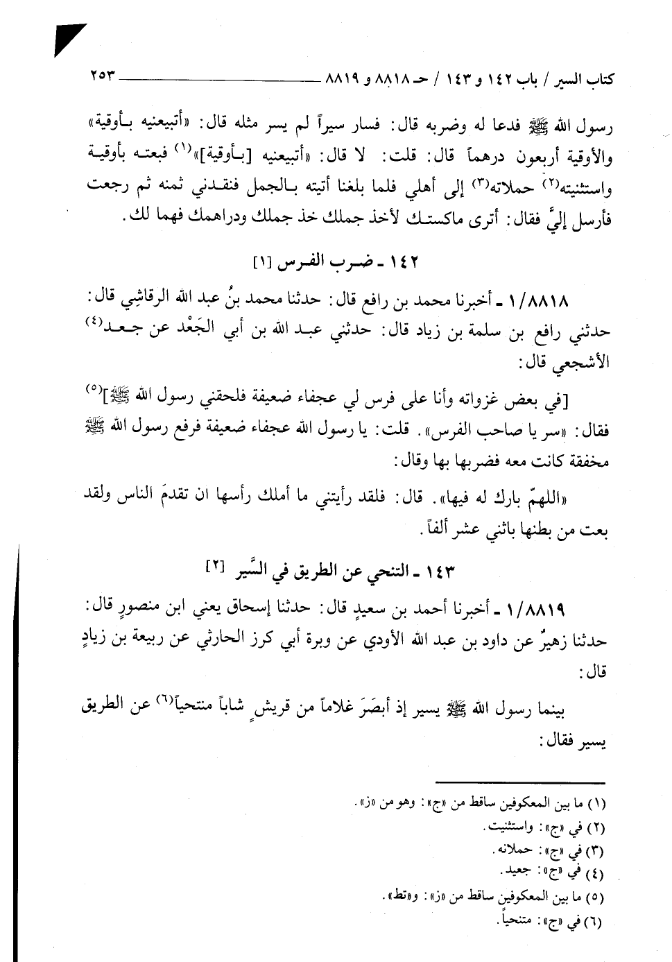 8818 - أخبرنا محمد بن رافع قال حدثنا محمد بن عبد الله الرقاشي قال حدثني رافع بن سلمة بن زياد قال حدثني عبد الله بن أبي الجعد عن جعد الأشجعي قال في بعض غزواته وأنا على فرس لي عجفاء ضعيفة فلحقنى رسول الله صلى الله عليه و سلم فقال : سر يا صاحب الفرس قلت يا رسول الله عجفاء ضعيفة فرفع رسول الله صلى الله عليه و سلم مخفقة كانت معه فضربها بها وقال اللهم بارك له فيها قال فلقد رأيتني ما أملك رأسها ان تقدم الناس ولقد بعت من بطنها باثنى عشر ألفا