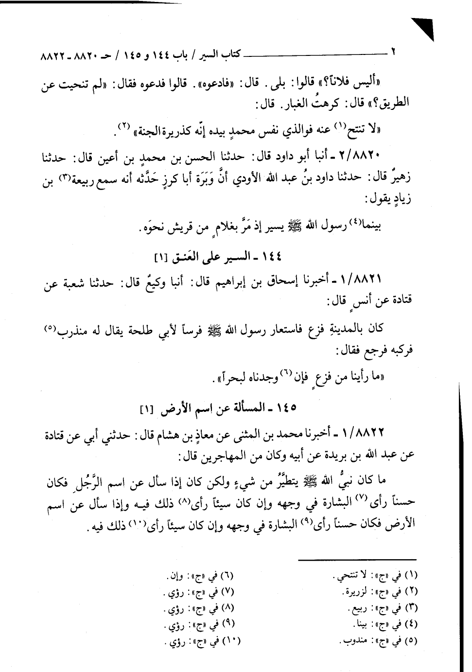 8821 - أخبرنا إسحاق بن إبراهيم قال أنبأ وكيع قال حدثنا شعبة عن قتادة عن أنس قال : كان بالمدينة فزع فاستعار رسول الله صلى الله عليه و سلم فرسا لأبي طلحة يقال له منذرب فركبه فرجع فقال ما رأينا من فزع فإن وجدناه لبحرا