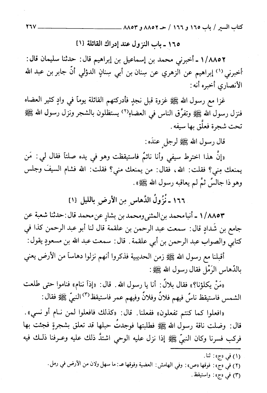 8852 - أخبرني محمد بن إسماعيل بن إبراهيم قال حدثنا سليمان قال أخبرني إبراهيم عن الزهري عن سنان بن أبي سنان الدؤلي أن جابر بن عبد الله الأنصاري أخبره : أنه غزا مع رسول الله صلى الله عليه و سلم غزوة قبل نجد فأدركتهم القائلة يوما في واد كثير العضاة فنزل رسول الله صلى الله عليه و سلم وتفرق الناس في العضاه يستظلون بالشجر ونزل رسول الله صلى الله عليه و سلم تحت شجرة فعلق بها سيفه قال رسول الله صلى الله عليه و سلم لرجل عنده إن هذا اخترط سيفي وأنا نائم فاستيقظت وهو في يده صلتا فقال لي من يمنعك مني فقلت الله فقال من يمنعك مني فقلت الله فشام السيف وجلس وهو ذا جالس ثم لم يعاقبه رسول الله صلى الله عليه و سلم