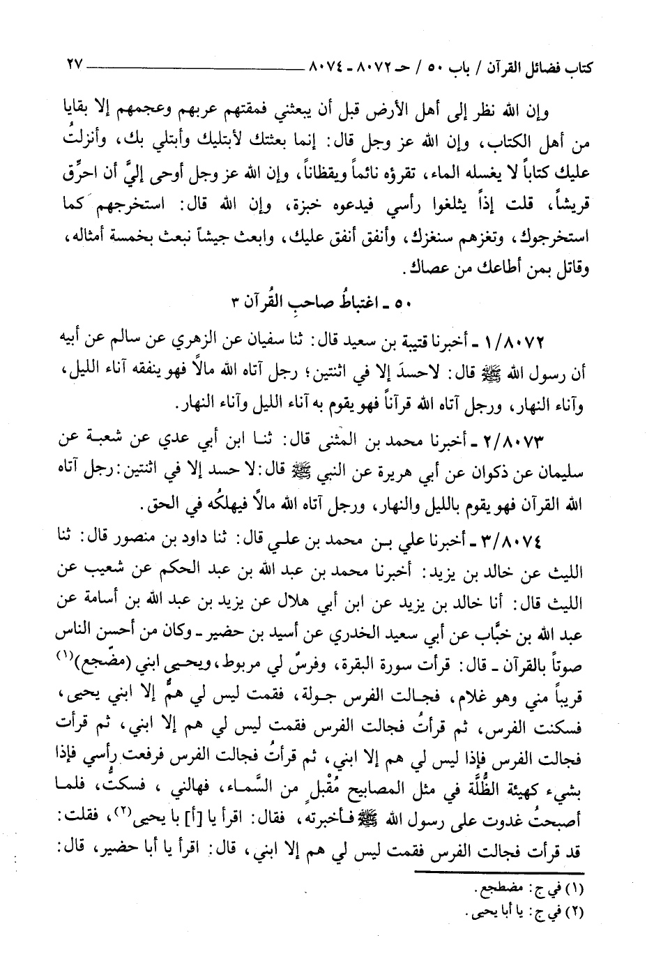 8072 - أخبرنا قتيبة بن سعيد قال ثنا سفيان عن الزهري عن سالم عن أبيه أن رسول الله صلى الله عليه و سلم قال : لا حسد إلا في اثنتين رجل آتاه الله مالا فهو ينفقه آناء الليل وآناء النهار ورجل آتاه الله قرآنا فهو يقوم به آناء الليل وآناء النهار