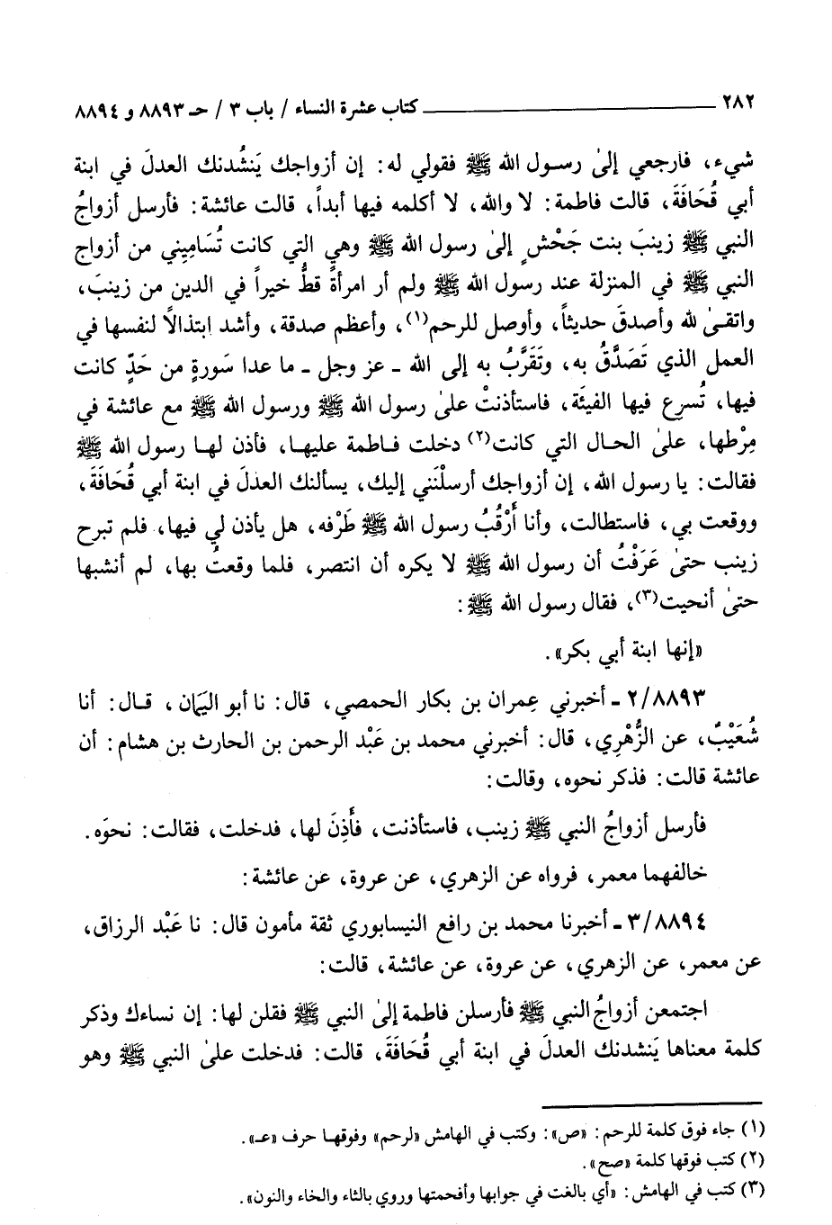 8894 - أخبرنا محمد بن رافع النيسابوري ثقة مأمون قال نا عبد الرزاق عن معمر عن الزهري عن عروة عن عائشة قالت : اجتمعن أزواج النبي صلى الله عليه و سلم فأرسلن فاطمة إلى النبي صلى الله عليه و سلم فقلن لها إن نساءك وذكر كلمة معناها ينشدنك العدل في ابنة أبي قحافة قالت فدخلت على النبي صلى الله عليه و سلم وهو مع عائشة في مرطها فقالت له إن نساءك أرسلنني وهن ينشدنك العدل في ابنة أبي قحافة فقال لها النبي صلى الله عليه و سلم أتحبينني فقالت نعم قال فأحبيها قالت فرجعت إليهن فأخبرتهن بما قال لهن فقلن إنك لم تصنعي شيئا فارجعي إليه فقالت والله لا أرجع إليه فيها أبدا وكانت ابنة رسول الله صلى الله عليه و سلم حقا فأرسلن زينب بنت جحش قالت عائشة وهي التي كانت تساميني من أزواج النبي صلى الله عليه و سلم فقالت إن أزواجك أرسلنني وهن ينشدنك العدل في ابنة أبي قحافة ثم أقبلت علي فشتمتني فجعلت أرقب النبي صلى الله عليه و سلم وأنظر طرفه هل يأذن لي في أن أنتصر منها قالت فشتمتني حتى ظننت أنه لا يكره أن أنتصر منها فاستقبلتها فلم ألبث أن أفحمتها فقال لها النبي صلى الله عليه و سلم إنها ابنة أبي بكر قالت عائشة ولم أر امرأة أكثر خيرا ولا أكثر صدقة وأوصل لرحم وأبذل لنفسها من كل شيء يتقرب به إلى الله عز و جل من زينب ما عدا سورة من حد كان فيها توشك فيها الفيئة قال أبو عبد الرحمن هذا خطأ والصواب الذي قبله