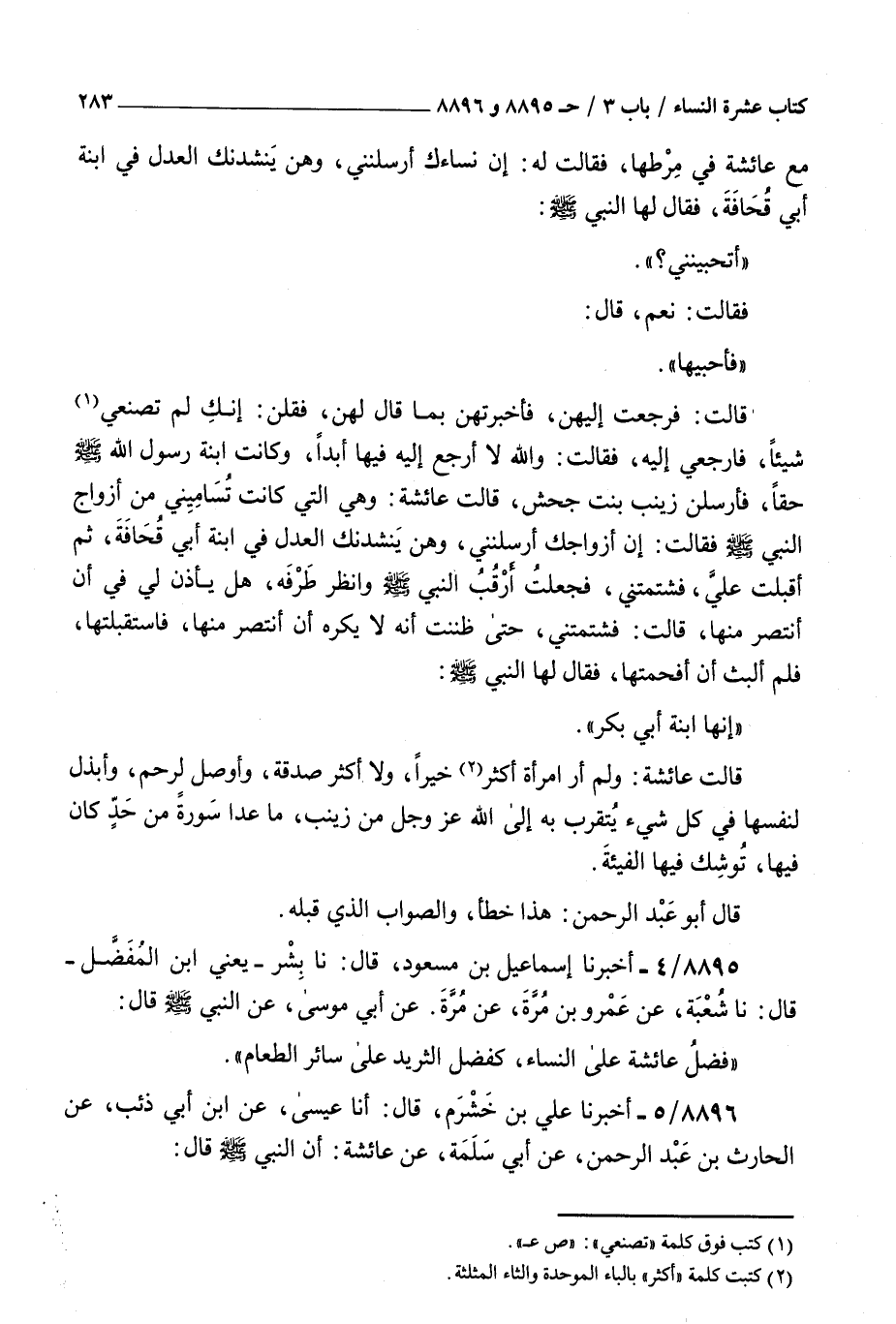 8895 - أخبرنا إسماعيل بن مسعود قال نا بشر يعني بن المفضل قال نا شعبة عن عمرو بن مرة عن أبي موسى عن النبي صلى الله عليه و سلم قال : فضل عائشة على النساء كفضل الثريد على سائر الطعام