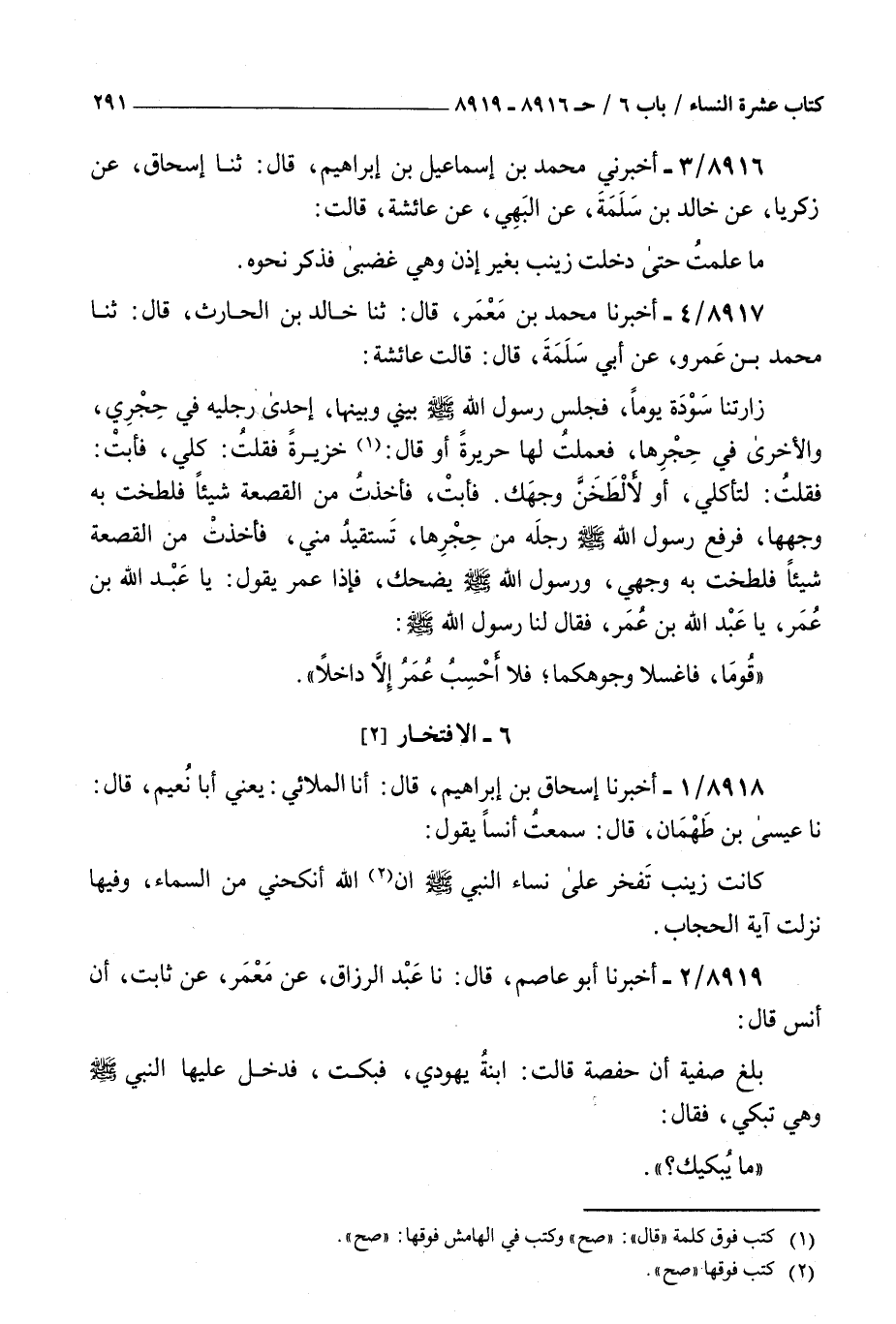 8916 - أخبرني محمد بن إسماعيل بن إبراهيم قال ثنا إسحاق عن زكريا عن خالد بن سلمة عن البهي عن عائشة قالت : ما علمت حتى دخلت زينب بغير إذن وهي غضبى فذكر نحوه