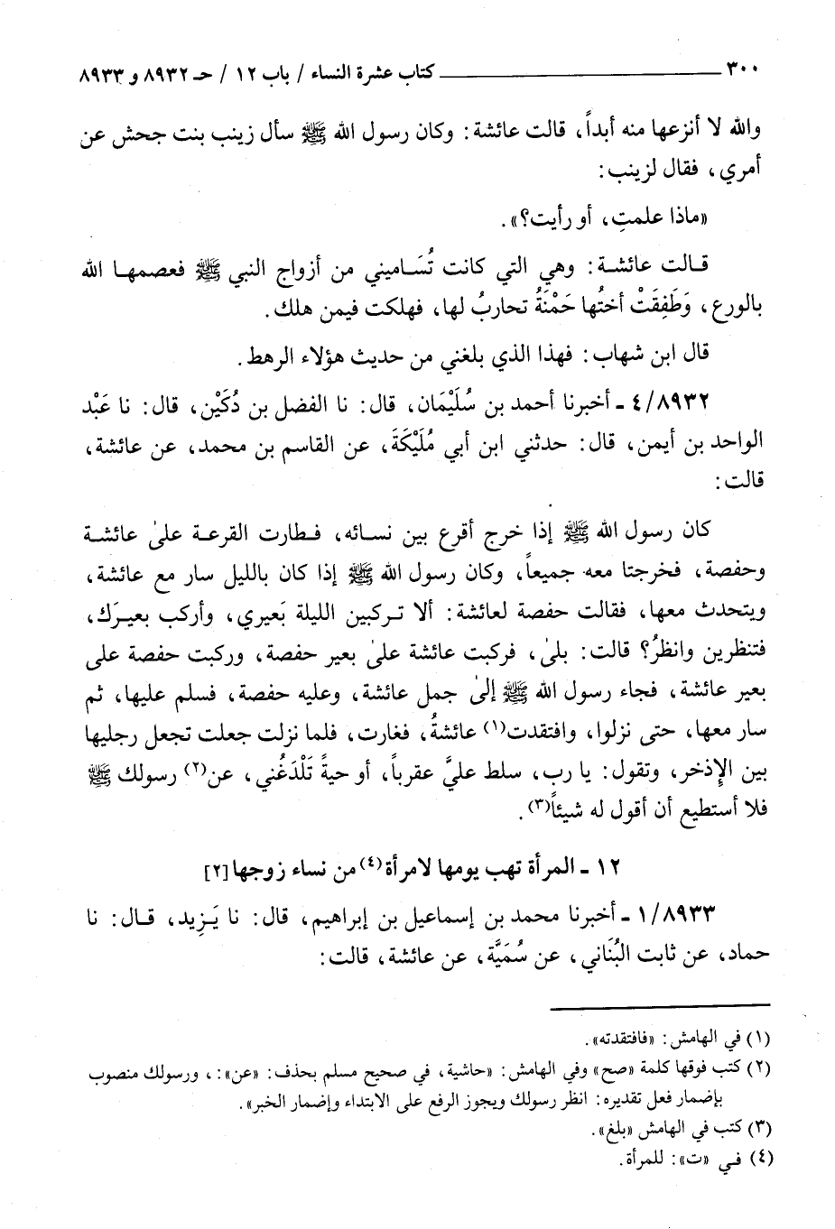 8932 - أخبرنا أحمد بن سليمان قال نا الفضل بن دكين قال نا عبد الواحد بن أيمن قال حدثني بن أبي مليكة عن القاسم بن محمد عن عائشة قالت : كان رسول الله صلى الله عليه و سلم إذا خرج أقرع بين نسائه فطارت القرعة على عائشة وحفصة فخرجتا معه جميعا وكان رسول الله صلى الله عليه و سلم إذا كان بالليل سار مع عائشة ويتحدث معها فقالت حفصة لعائشة ألا تركبين الليلة بعيري وأركب بعيرك فتنظرين وأنظر قالت بلى فركبت عائشة على بعير حفصة وركبت حفصة على بعير عائشة فجاء رسول الله صلى الله عليه و سلم إلى جمل عائشة وعليه حفصة فسلم عليها ثم سار معها حتى نزلوا وافتقدت عائشة فغارت فلما نزلت جعلت تجعل رجليها بين الإذخر وتقول يا رب سلط علي عقربا أو حية تلدغني عن رسولك صلى الله عليه و سلم فلا أستطيع أن أقول له شيئا