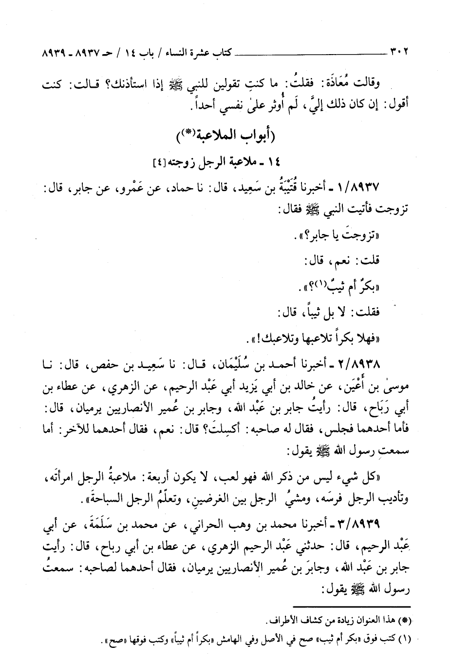8937 - أخبرنا قتيبة بن سعيد قال نا حماد عن عمرو عن جابر قال تزوجت فأتيت النبي صلى الله عليه و سلم فقال تزوجت : يا جابر قلت نعم قال بكر أم ثيب فقلت لا بل ثيبا قال فهلا بكرا تلاعبها وتلاعبك