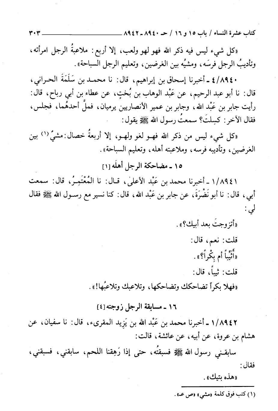 8940 - أخبرنا إسحاق بن إبراهيم قال نا محمد بن سلمة الحراني قال نا أبو عبد الرحيم عن عبد الوهاب بن بخت عن عطاء بن أبي رباح قال : رأيت جابر بن عبد الله وجابر بن عمير الأنصاريين يرميان فمل أحدهما فجلس فقال الآخر كسلت سمعت رسول الله صلى الله عليه و سلم يقول كل شيء ليس من ذكر الله فهو لغو ولهو إلا أربعة خصال مشي بين الغرضين وتأديبه فرسه وملاعبته أهله وتعليم السباحة