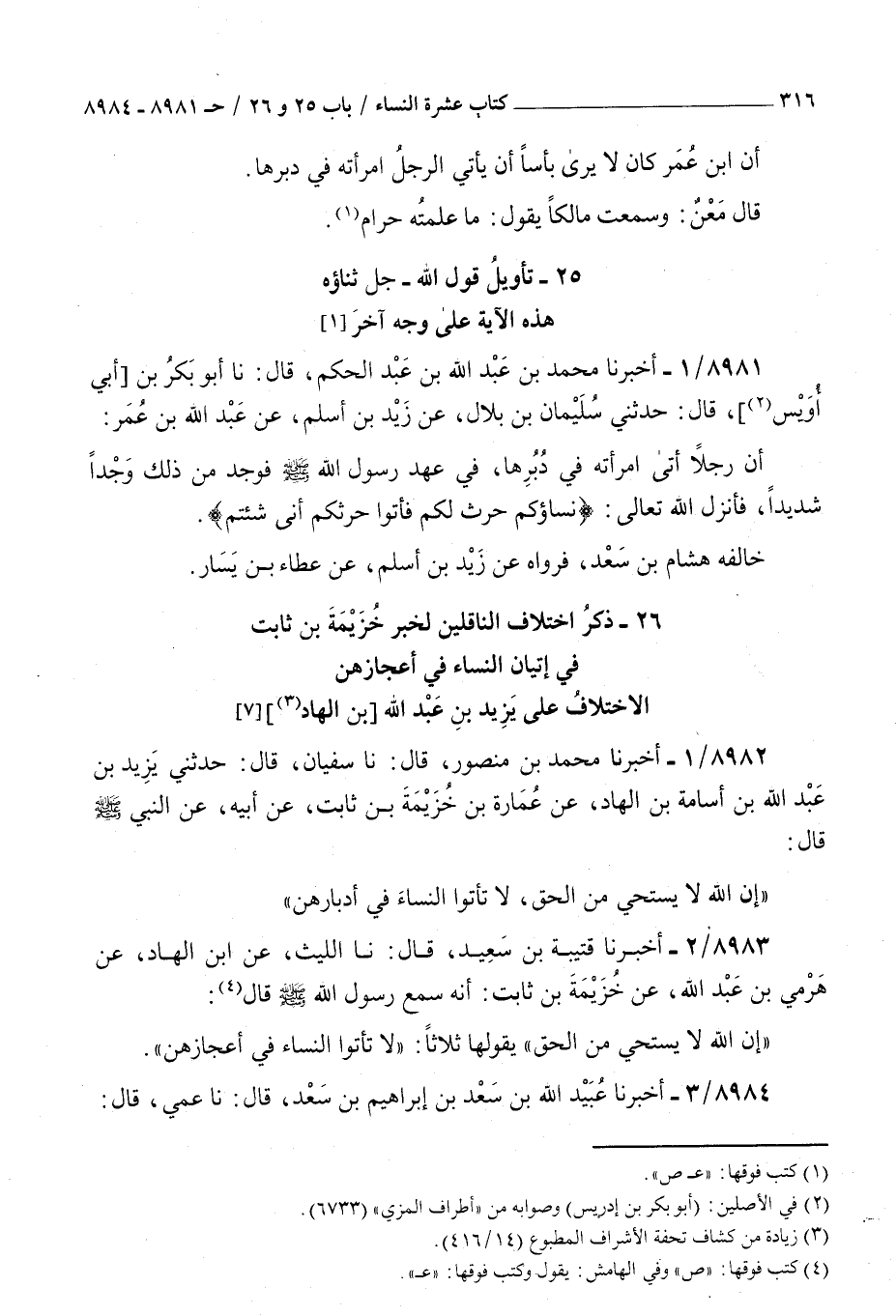 8982 - أخبرنا محمد بن منصور قال نا سفيان قال حدثني يزيد بن عبد الله بن أسامة بن الهاد عن عمارة بن خزيمة بن ثابت عن أبيه عن النبي صلى الله عليه و سلم قال : إن الله لا يستحي من الحق لا تأتوا النساء في أدبارهن