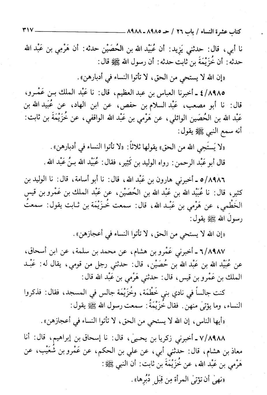 8987 - أخبرني عمرو بن هشام عن محمد بن سلمة عن بن إسحاق عن عبيد الله بن عبد الله بن حصين قال حدثني رجل من قومي يقال له عبد الملك بن عمرو بن قيس قال حدثني هرمي بن عبد الله قال كنت جالسا في نادي بني خطمة وخزيمة جالس في المسجد فقال فذكروا النساء وما يؤتى منهن فقال خزيمة سمعت رسول الله صلى الله عليه و سلم يقول أيها الناس : أن الله لا يستحي من الحق لا تأتوا النساء في أدبارهن