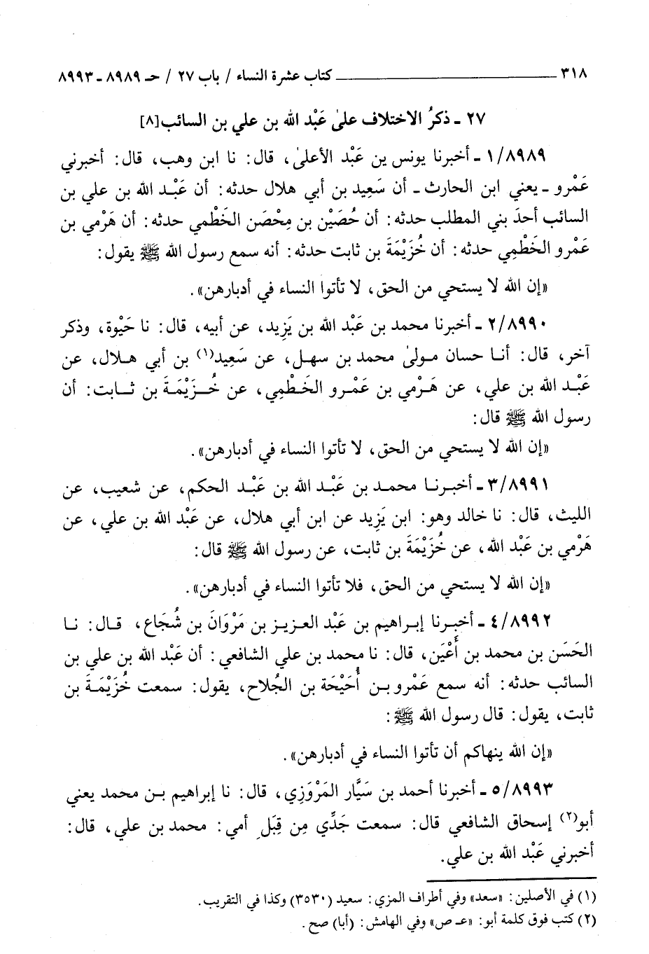 8993 - أخبرنا أحمد بن سيار المروزي قال نا إبراهيم بن محمد يعني أبو إسحاق الشافعي قال سمعت جدي من قبل أمي محمد بن علي قال أخبرني عبد الله بن علي أنه لقي عمرو بن أحيحة بن الجلاح فسأله هل سمعت في إتيان المرأة في دبرها شيئا فقال أشهد لسمعت خزيمة بن ثابت يقول إن رسول الله صلى الله عليه و سلم قال : إن الله ينهاكم أن تأتوا النساء في أدبارهن