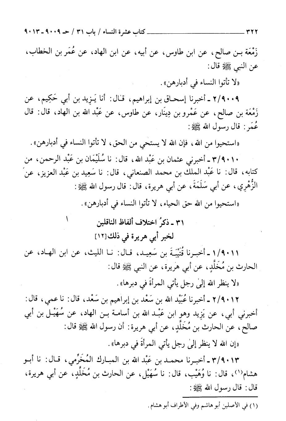 9010 - أخبرني عثمان بن عبد الله قال نا سليمان بن عبد الرحمن من كتابه قال نا عبد الملك بن محمد الصنعاني قال نا سعيد بن عبد العزيز عن الزهري عن أبي سلمة عن أبي هريرة قال قال رسول الله صلى الله عليه و سلم : استحيوا من الله حق الحياء لا تأتوا النساء في أدبارهن