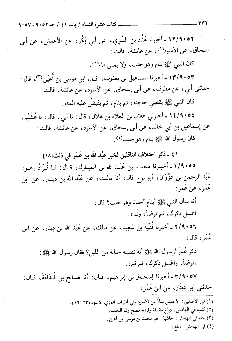 9052 - أخبرنا هناد بن السري عن أبي بكر عن الأعمش عن أبي إسحاق عن الأسود عن عائشة قالت : كان النبي صلى الله عليه و سلم ينام وهو جنب ولا يمس ماء