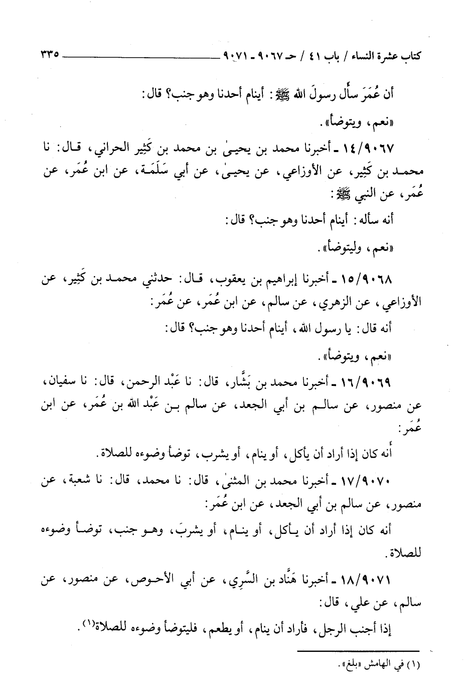9067 - أخبرنا محمد بن يحيى بن محمد بن كثير الحراني قال نا محمد بن كثير عن الأوزاعي عن يحيى عن أبي سلمة عن بن عمر عن عمر عن النبي صلى الله عليه و سلم : أنه سأله أينام أحدنا وهو جنب قال نعم وليتوضأ