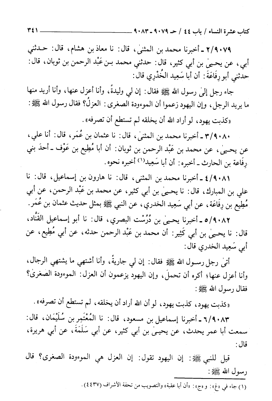 9079 - أخبرنا محمد بن المثنى قال نا معاذ بن هشام قال حدثني أبي عن يحيى بن أبي كثير قال حدثني محمد بن عبد الرحمن بن ثوبان قال حدثني أبو رفاعة أن أبا سعيد الخدري قال جاء رجل إلى رسول الله صلى الله عليه و سلم فقال : إن لي وليدة وأنا أعزل عنها وأنا أريد منها ما يريد الرجل وإن اليهود زعموا أن الموءودة الصغرى العزل فقال رسول الله صلى الله عليه و سلم كذبت يهود لو أراد الله أن يخلقه لم تستطع أن تصرفه