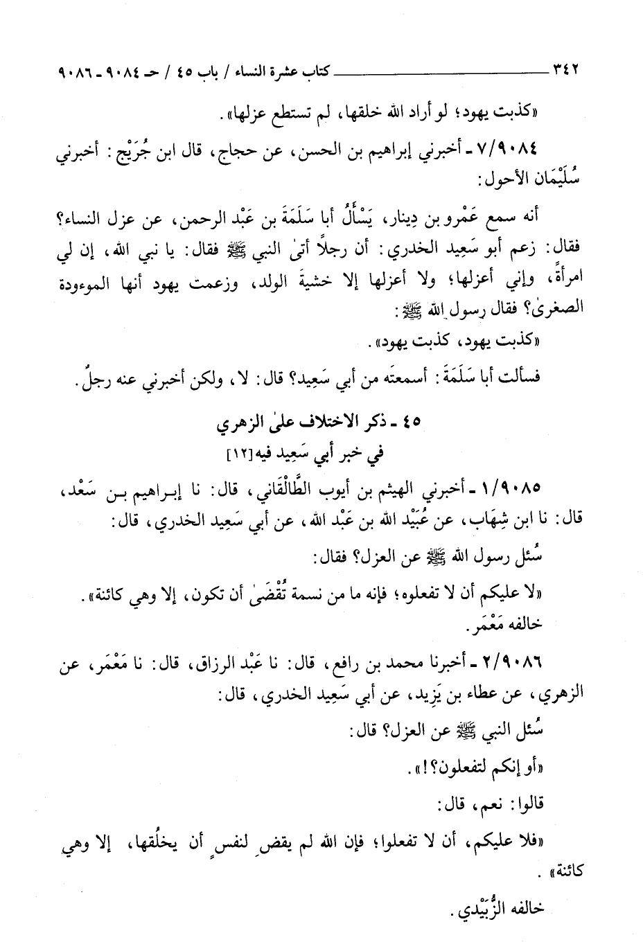 9084 - أخبرني إبراهيم بن الحسن عن حجاج قال بن جريج أخبرني سليمان الأحول أنه سمع عمرو بن دينار يسأل أبا سلمة بن عبد الرحمن عن عزل النساء فقال زعم أبو سعيد الخدري أن رجلا أتى النبي صلى الله عليه و سلم فقال : يا نبي الله إن لي امرأة وإني أعزلها ولا أعزلها إلا خشية الولد وزعمت يهود أنها الموءودة الصغرى فقال رسول الله صلى الله عليه و سلم كذبت يهود كذبت يهود فسألت أبا سلمة أسمعته من أبي سعيد قال لا ولكن أخبرني عنه رجل