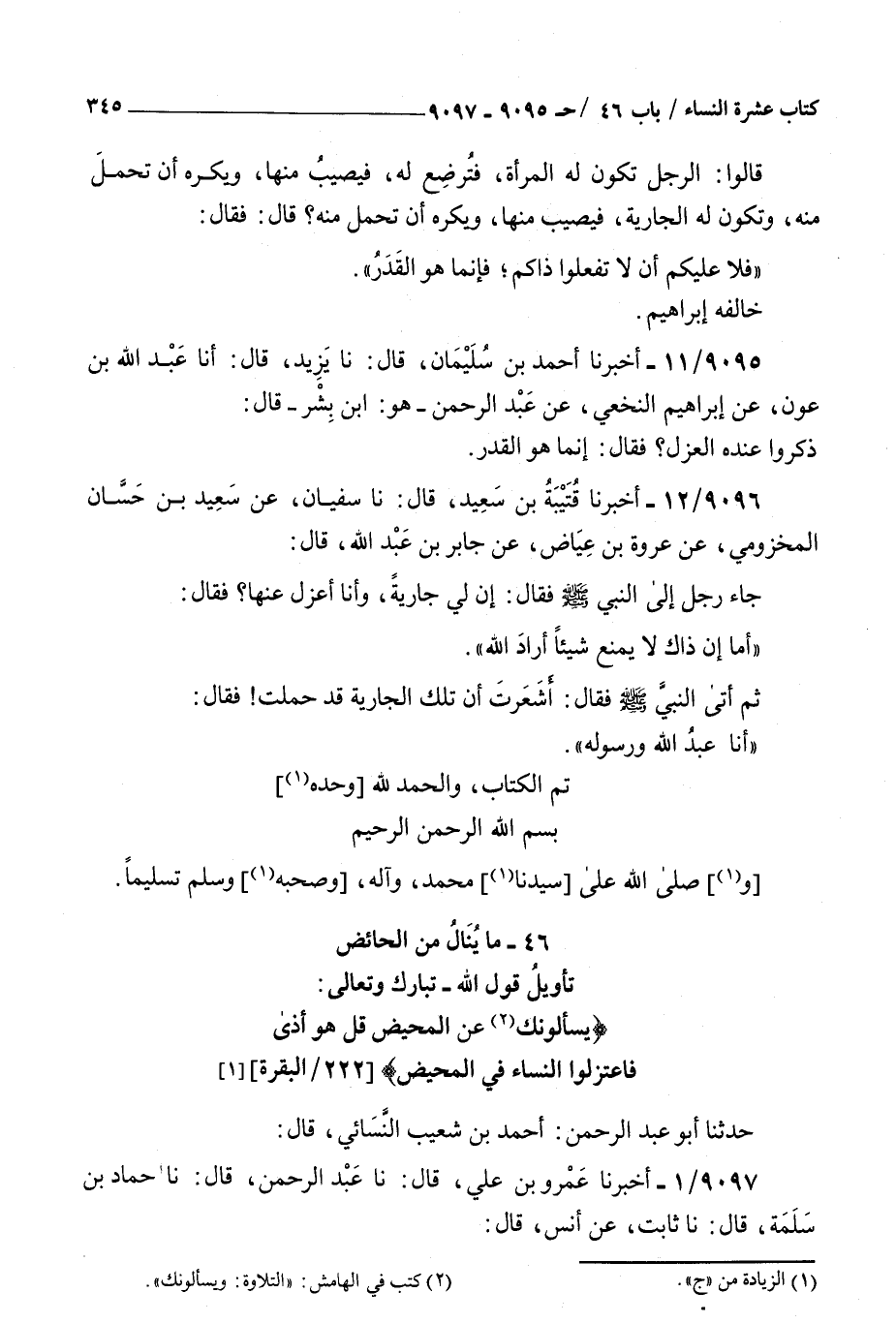 9095 - أخبرنا أحمد بن سليمان قال نا يزيد قال أنا عبد الله بن عون عن إبراهيم النخعي عن عبد الرحمن هو بن بشر قال : ذكروا عنده العزل فقال إنما هو القدر
