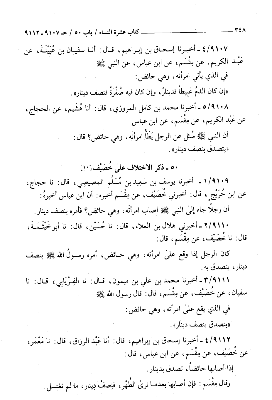 9107 - أخبرنا إسحاق بن إبراهيم قال أنا سفيان بن عيينة عن عبد الكريم عن مقسم عن بن عباس عن النبي صلى الله عليه و سلم : في الذي يأتي امرأته وهي حائض إن كان الدم عبيطا فدينار وإن كان فيه صفرة فنصف دينار