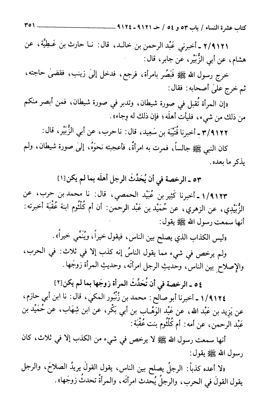 9122 - أخبرنا قتيبة بن سعيد قال نا حرب عن أبي الزبير قال : كان النبي صلى الله عليه و سلم جالسا فمرت به امرأة فأعجبته نحوه إلى صورة شيطان ولم يذكر ما بعده