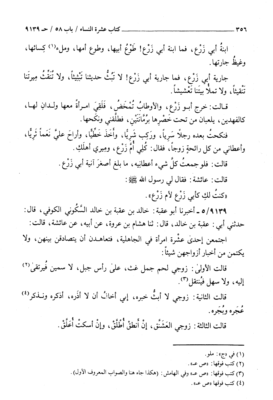 9139 - أخبرنا أبو عقبة خالد بن عقبة بن خالد السكوني الكوفي قال حدثني أبي عقبة بن خالد قال ثنا هشام بن عروة عن أبيه عن عائشة قالت : اجتمعن إحدى عشرة امرأة في الجاهلية فتعاهدن أن يتصادقن بينهن ولا يكتمن من أخبار أزواجهن شيئا قالت الأولى زوجي لحم جمل غث على رأس جبل لا سمين فيرتقى إليه ولا سهل فينتقل قالت الثانية زوجي لا أبث خبره إني أخاف أن لا أذره أذكره ونذكر عجره وبجره قالت الثالثة زوجي العشنق إن أنطق أطلق وإن أسكت أعلق [ ص 357 ] قالت الرابعة زوجي كليل تهامة لا حر ولا قر ولا مخافة ولا سآمة قالت الخامسة زوجي إذا دخل فهد وإذا خرج أسد ولا يسأل عما عهد قالت السادسة زوجي إذا أكل لف وإذا شرب اشتف وإذا هجع التف ولا يولج الكف فيعلم البث قالت السابعة زوجي عياياء طباقاء كل داء له داء شجك أو فلك أو جمع كلا لك وقالت الثامنة زوجي رضيع العماد طويل النجاء عظمي الرماد قريب البيت من الناد قالت التاسعة زوجي ألمس مس أرنب والريح ريح زرنب وأنا أغلبه والناس يغلب قالت العاشرة زوجي مالك وما مالك مالك خير من ذلك له إبل كثيرات المبارك قليلات المسارح إذا سمعن صوت المزهر أيقن أنهن هوالك قالت الإحدي عشرة زوجي أبو زرع وما أبو زرع أناس من حلي أذني وملأ شحم عضدي فبجحني فبجحت نفسي إلي وجدني في أهل غنيمة بشق فجعلني في سهيل وأطيط ودياس ومنق فعنده أقول فلا أقبح وأشرب فأتقنح وأرقد فأتصبح أم أبي زرع وما أم أبي زرع عكومها رداح وبيتها فساح بن أبي زرع وما بن أبي زرع مضجعة كمسل شطبة وتشبعه ذراع الجفرة ابنة أبي زرع فما ابنة أبي زرع طوع أبيها وطوع أمها وصفر ردائها وملء كسائها وغيظ جارتها جارية أبي زرع وما جارية أبي زرع لا تبث حديثنا تبثيثا ولا تغش ميرتنا تغشيشا ولا تملأ بيتنا تعشيشا خرج من عندي أبو زرع والأوطاب تمخض فلقي امرأة لها ابنان كالفهدين يلعبان من تحت خصرها برمانتين فنكحها أبو زرع وطلقني فنكحت من بعده رجلا سريا ركب شريا وأخذ خطيا وأراح علي نعما ثريا فقال كلي وميري أهلك فلو جمعت كل الذي أعطاني ما بلغت إناء من إناء أبي زرع قالت عائشة فقال لي رسول الله صلى الله عليه و سلم فكنت لك كأبي زرع لأم زرع