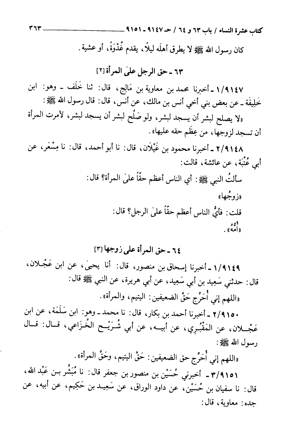 9148 - أخبرنا محمود بن غيلان قال نا أبو أحمد قال نا مسعر عن أبي عتبة عن عائشة قالت : سألت النبي صلى الله عليه و سلم أي الناس أعظم حقا على المرأة قال زوجها قلت فأي الناس أعظم حقا على الرجل قال أمه