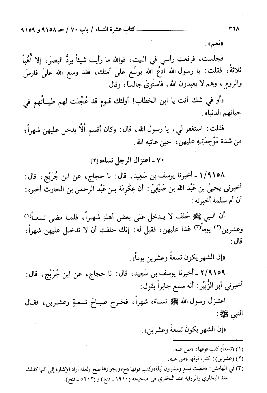 9159 - أخبرنا يوسف بن سعيد قال نا حجاج عن بن جريج قال أخبرني أبو الزبير أنه سمع جابرا يقول : اعتزل رسول الله صلى الله عليه و سلم نساءه شهرا فخرج صباح تسعة وعشرين فقال النبي صلى الله عليه و سلم إن الشهر يكون تسعة وعشرين ثم صفق نبي الله صلى الله عليه و سلم بيديه ثلاثا مرتين بأصابع يديه كلها والثالثة بالتسع منها