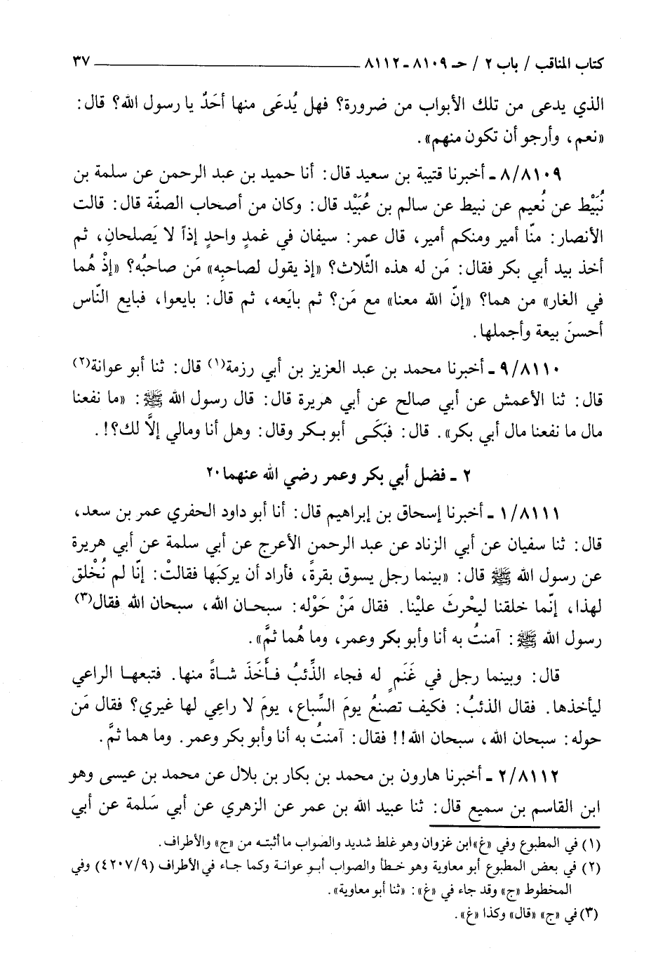 8112 - أخبرنا هارون بن محمد بن بكار بن بلال عن محمد بن عيسى وهو بن القاسم بن سميع قال ثنا عبيد الله بن عمر عن الزهري عن أبي سلمة عن أبي هريرة : أن النبي صلى الله عليه و سلم أقبل على الناس فقال بينما رجل يسوق بقرة أراد أن يركبها فأقبلت عليه فقالت إنا لم نخلق لهذا إنما خلقنا للحراثة فقال من حوله سبحان الله تكلمت بقرة فقال رسول الله صلى الله عليه و سلم فإني آمنت به وأبو بكر وعمر وليس هما ثم وقال رجل بينما أنا في غنم إذ أقبل ذئب فأخذ شاة فطلبتها فأخذتها منه فقال لي كيف لها يوم السبع حيث لا يكون لها راع غيري قالوا سبحان الله تكلم ذئب فقال رسول الله صلى الله عليه و سلم فإني آمنت به وأبو بكر وعمر وليسا ثم